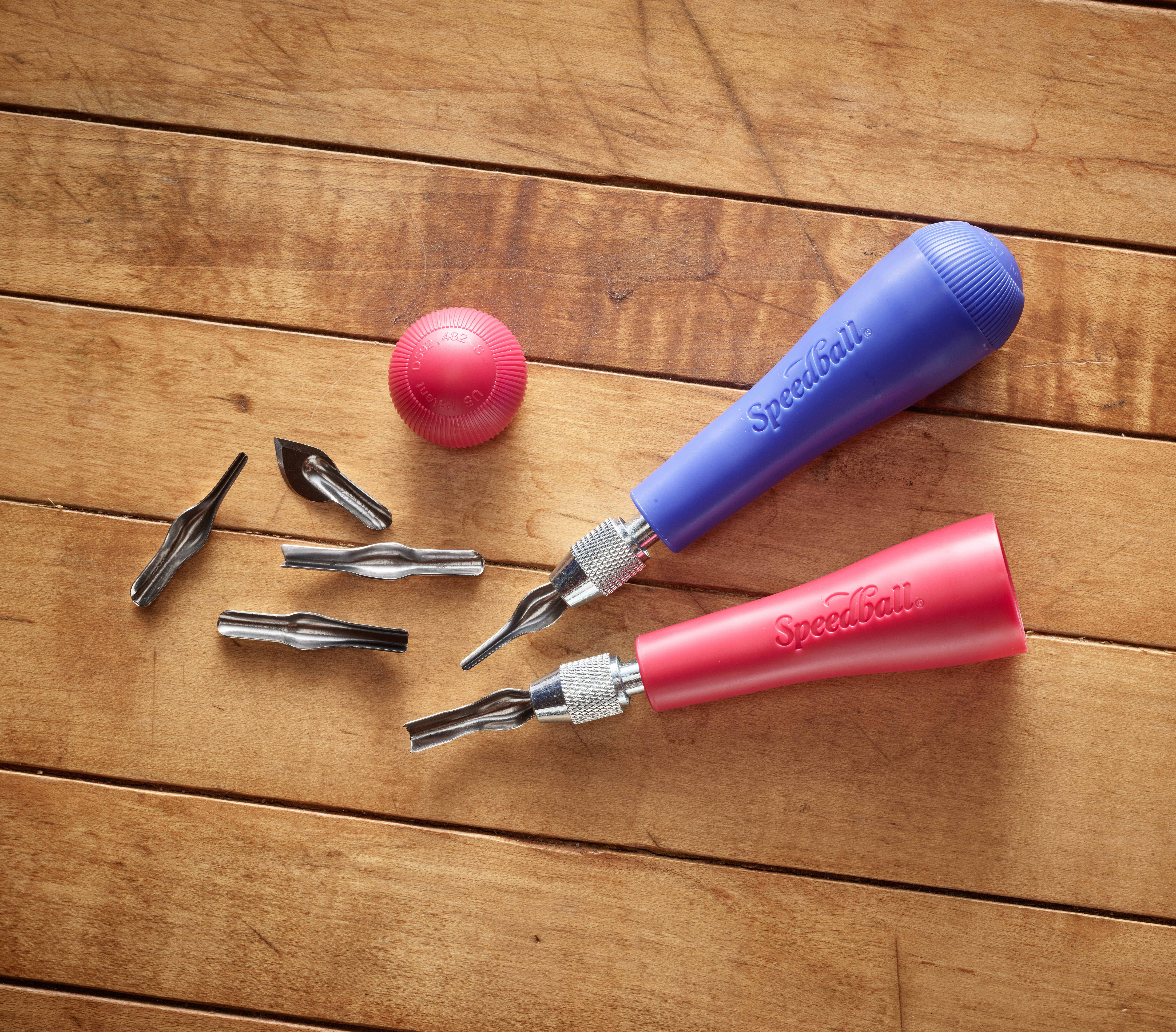 Speedball's lino handle and cutters have served as trusted studio favorites for artists for decades. Consistently noted for the ergonomic design and superior carving experience offered by the system, few even know there is a convenient storage solution offered in the handle too! Simply unscrew the end of the handle to keep your cutters from being lost or damaged between uses.