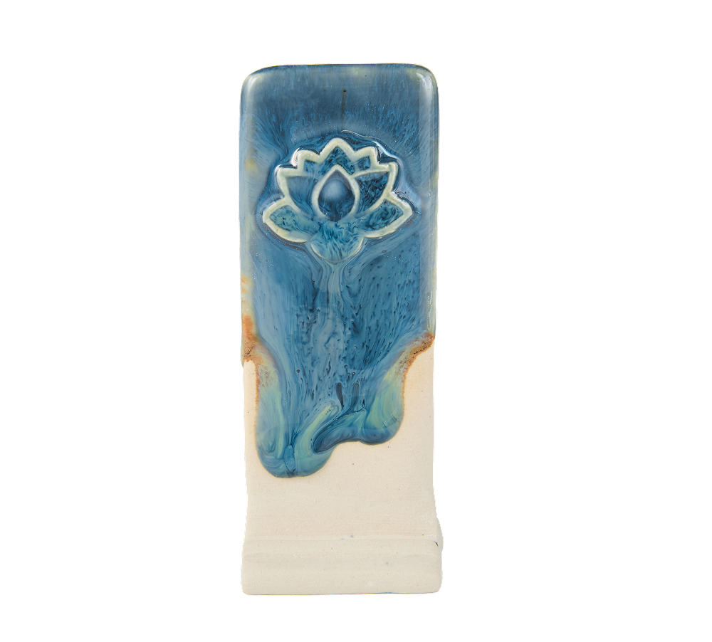 Cocoa Flux is a glossy glaze with a kiss of chocolate-colored undertones when used individually. An incredible glaze on its own, but it is meant for layering throughout the Mid-Fire glaze family (this tile is Cocoa Flux over Dragon's Eye). Cocoa Flux is highly effective with a standard 1-2 coats application to maximize eye-catching mottling. Formulated to cause fluxing or enhanced movement along ceramic surfaces, use caution when applying fluxes from midway to the bottom of outer ceramic vessels.