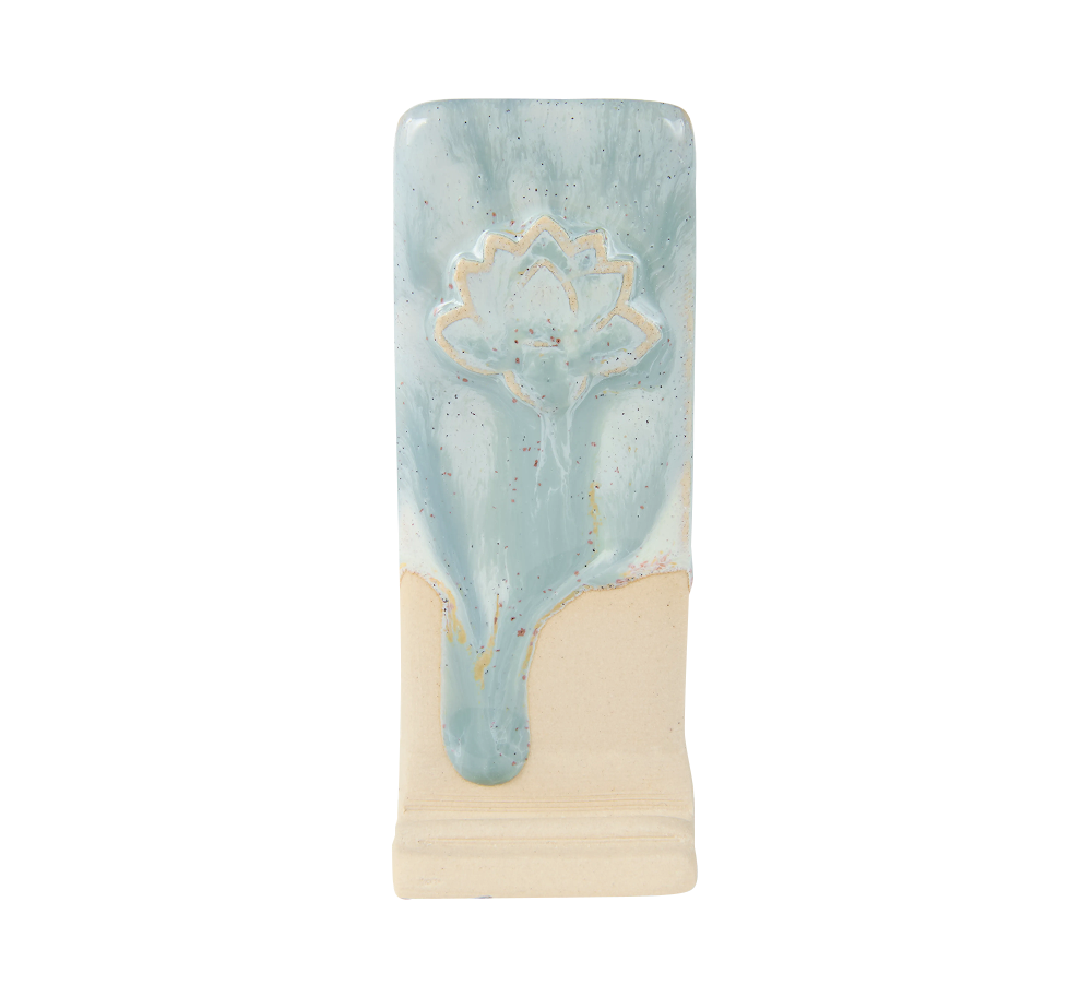 Vanilla Flux is a glossy glaze with a cascading white appearance when used individually. An incredible glaze on its own, but it is meant for layering throughout the Mid-Fire glaze family (this tile is Teal Agate over Vanilla Flux). Vanilla Flux is highly effective with a standard 1-2 coats application to maximize eye-catching mottling. Formulated to cause fluxing or enhanced movement along ceramic surfaces, use caution when applying fluxes from midway to the bottom of outer ceramic vessels.