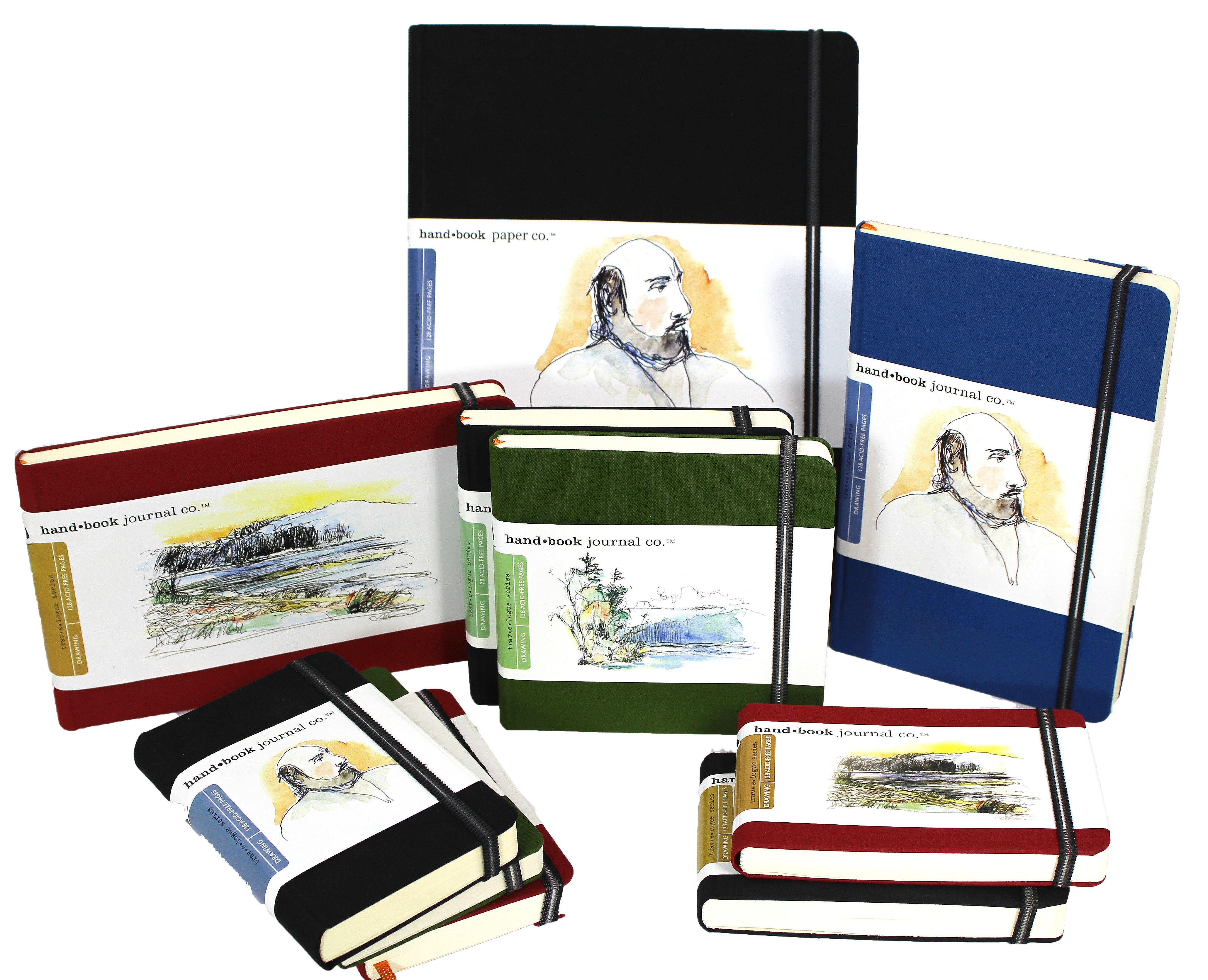Made from 140gsm, acid-free, artist paper, Travel Sketchbooks feature (64) sheets of artist-grade paper that is great for use with pen & ink, pencil and markers. Each book is bound with finely-woven European cloth, made with rounded corners, and includes a clear storage envelope on the inside back cover—all combining to offer the utmost durability when traveling. Available in (6) formats and across (4) cloth book cover colors.