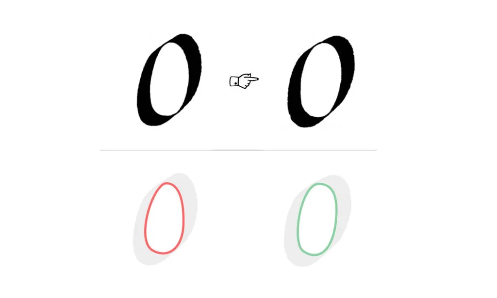 You can simply look at the counter of the letter instead of the strokes and decide whether it’s symmetrical. Avoid the egg-shaped counter of the o! It always feels heavyweight and awkward.