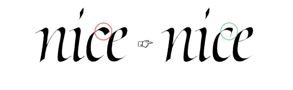 The short version: two thick strokes shouldn’t cross. When they do, they create a heavy, dark spot that pulls the eye and breaks the rhythm of the letter. You should be just as careful when the strokes only meet, like at the top of the a in the example.