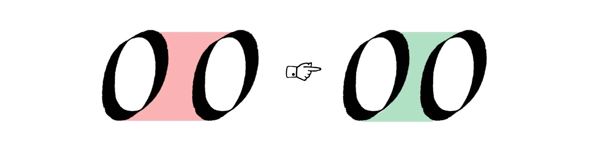 Let’s start with the simpler aspect. The spacing between two rounded letters needs to be closer, because of those additional areas above and below the curved parts. Think of the pairs like oo, oc, or oe. It’s the same problem and solution that we encountered in the previous parts when looking at the facing bowls.