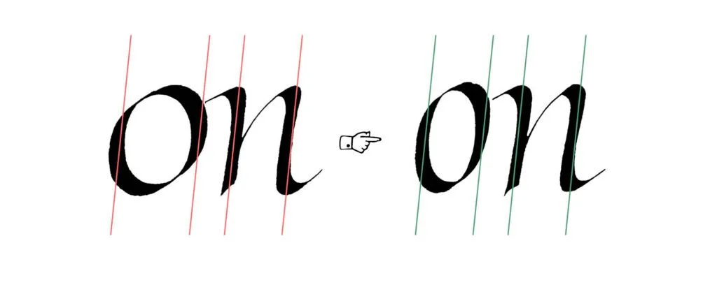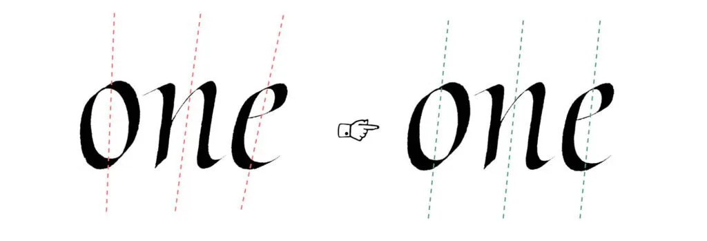 It’s easy to judge the slant of letters with straight strokes. But it’s much trickier with diagonal and rounded strokes. You need to visualize the axis of the letter, which results from the balance of all the strokes working together.