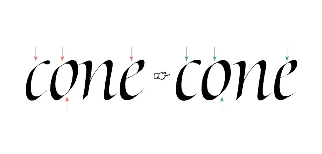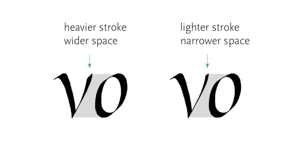 First, it’s important to understand that spacing can’t be measured by the physical distance between letters. Instead, think of it as creating an even distribution of negative space – the space between and around the strokes.