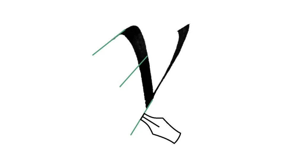 Another challenge lies in the weight of the diagonal strokes. If you stick to the same pen angle as for the vertical strokes, you might end up with a stroke that feels bulky – and we don’t want that. The solution to this problem is often to adjust the pen angle to a steeper value. A more effective approach is to use pen rotation. This means changing the angle as you write the stroke by shifting the pen in your hand. It’s pretty tricky to use, but it’s an essential technique if you want to elevate your calligraphy.