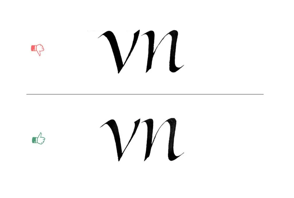 The right-side stroke is trickier: it should be lighter than the left, but not so light that it looks fragile compared to its neighbours. If it’s too heavy, it dominates the letter, and if it’s too light, it gets lost and breaks the rhythm. Judge it in context and aim for a v that still feels like it belongs to the same family.