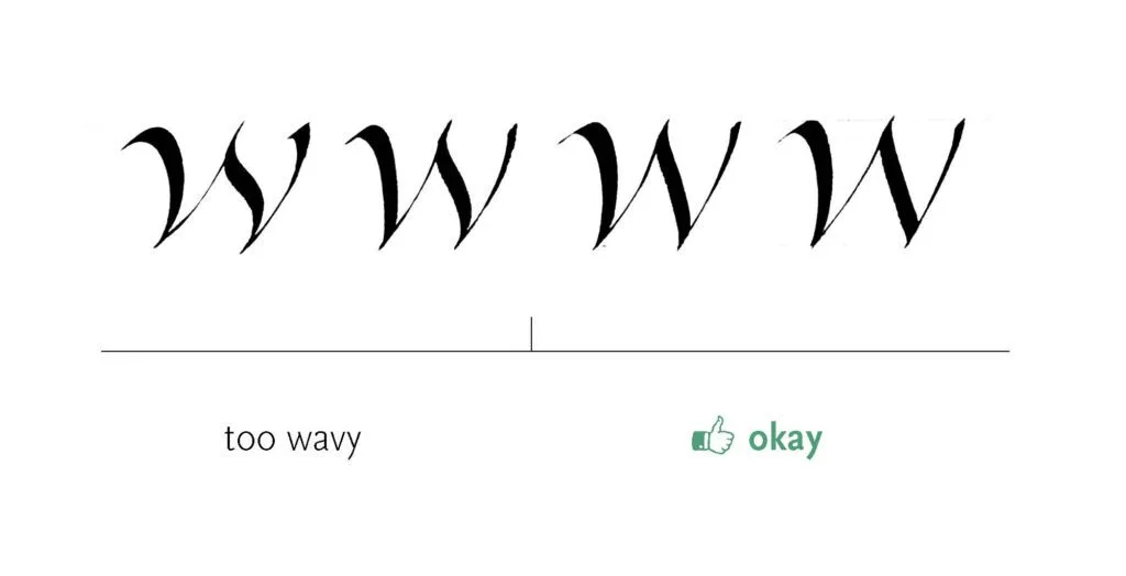The third stroke of the w can be given a gentle wave, but beginners often overdo this, which results in a wobbly, uneven form. If your Italic isn’t meant to look playful (which can be valid in some contexts) and you want an elegant, consistent feel, the strokes should resolve in a smooth, gradual manner. Few things disrupt rhythm more than a sudden wobble. This principle extends beyond w: a touch of waviness in swashes can be expressive, but if exaggerated, it creates the same problems of imbalance and broken flow.