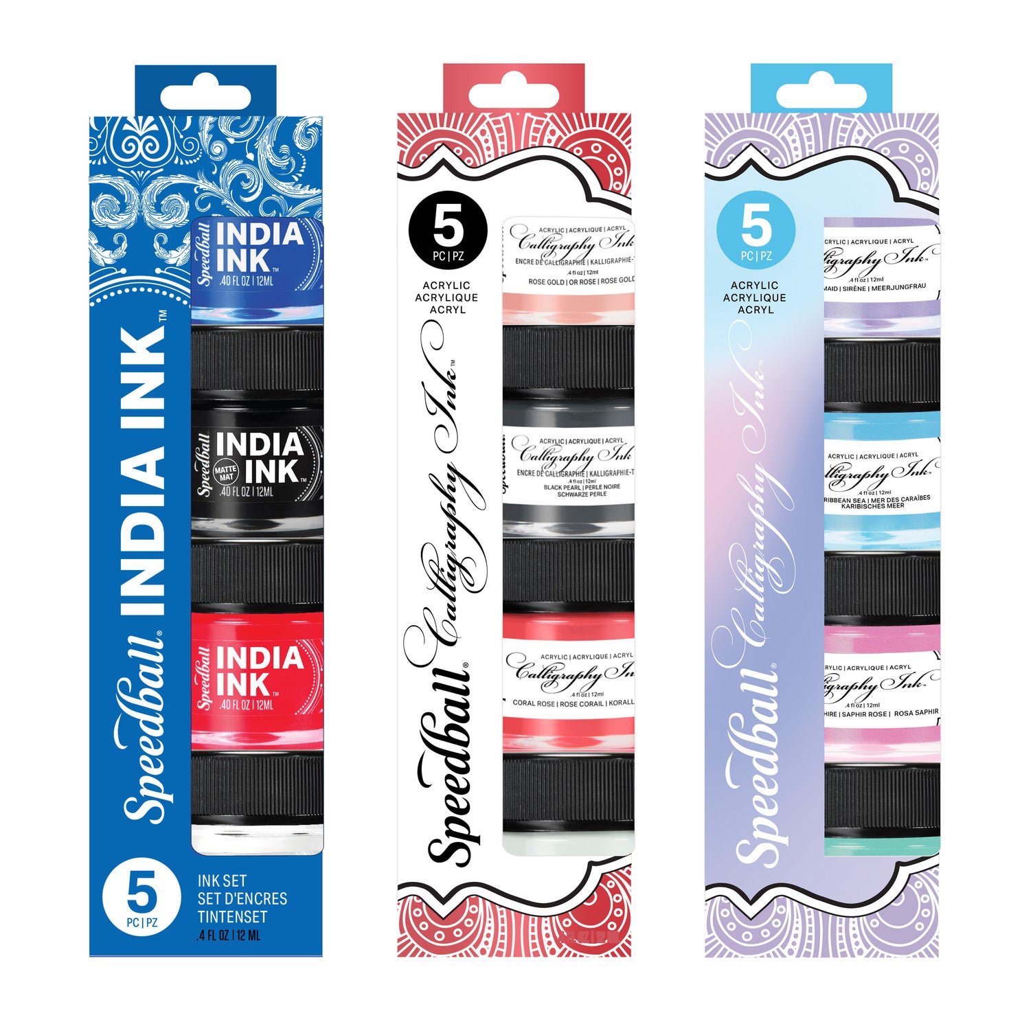 Speedball’s rich, vivid calligraphy inks are formulated with the highest quality pigments. Ideal for a variety of techniques including drawing, lettering, stamping, and airbrushing, Speedball Calligraphy Inks are inter-mixable, water-resistant, lightfast, acid-free and archival. Available in 12ml and 2oz sizes across 11 beautiful colors, including 2 metallics. Also featured in 5- and 10-ink sets.