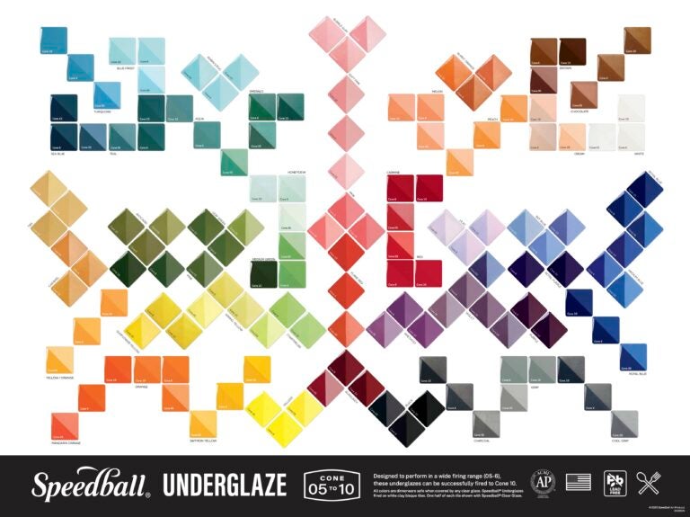 This beautiful poster showcases 108 total test tiles, all handmade and fired in Speedball’s lab, and is printed to accurately represent results for all 48 underglaze colors at Cones 05, 6 and 10 both with and without the use of the appropriate Speedball clear glaze. (17.875″x 23.875″)
