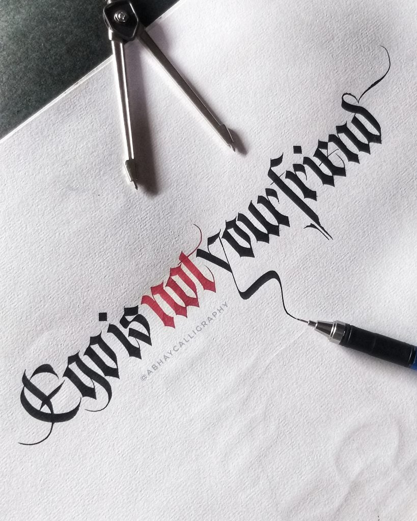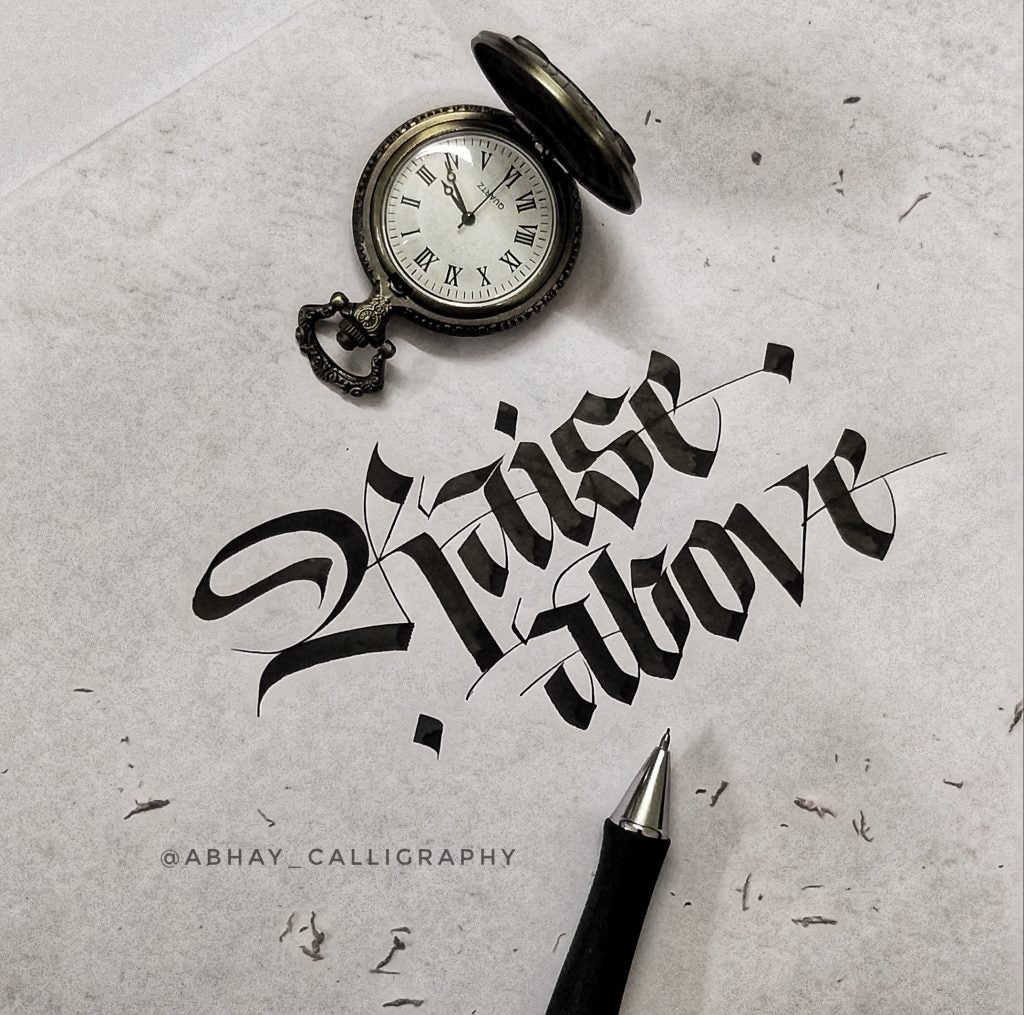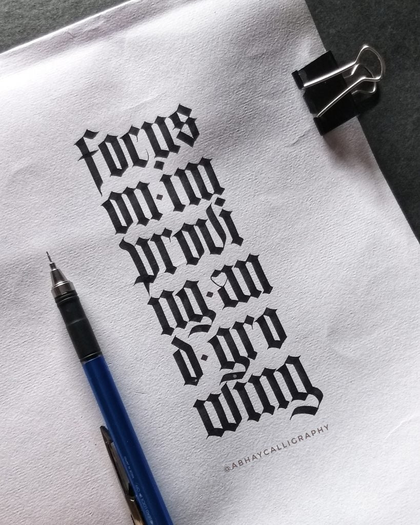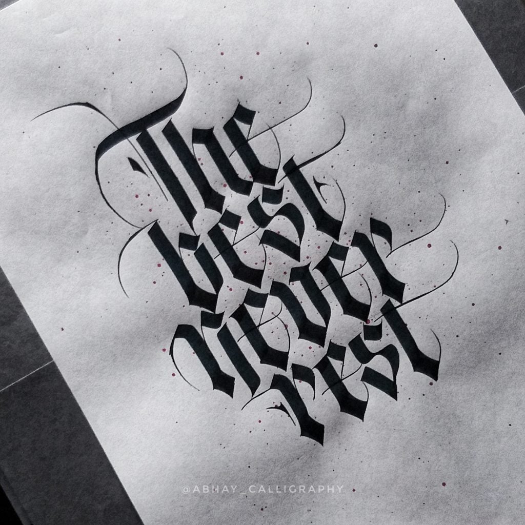 I am Abhay Pratap Singh Rathoud, an engineer turned Calligrapher & Handlettering Artist. I didn’t know anything about calligraphy up until my graduation [when] my friends introduced me to this art. I found it so therapeutic and mediative to watch all calligraphy-related videos and thats’s when I thought of giving it a shot. As usual, I did a lot of research, watched YouTube Videos to get some idea about the tools, scripts, books etc. Some fellow calligraphers definitely helped along the way. Since I was always fascinated with Blackletter, I started with one of the form of Blackletter which was Fraktur. Later, I taught myself Brush Lettering, Italics, Foundational Hand and other scripts.