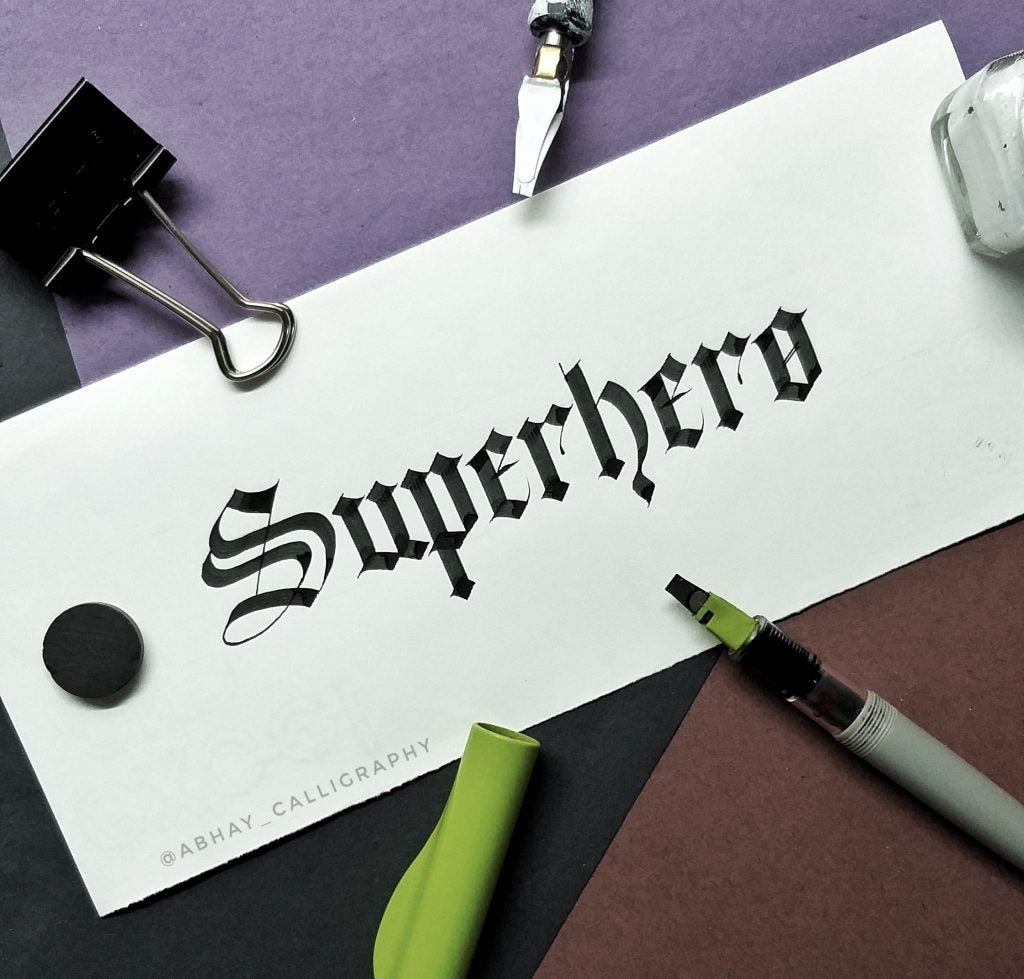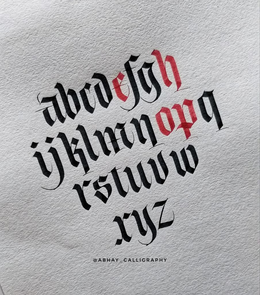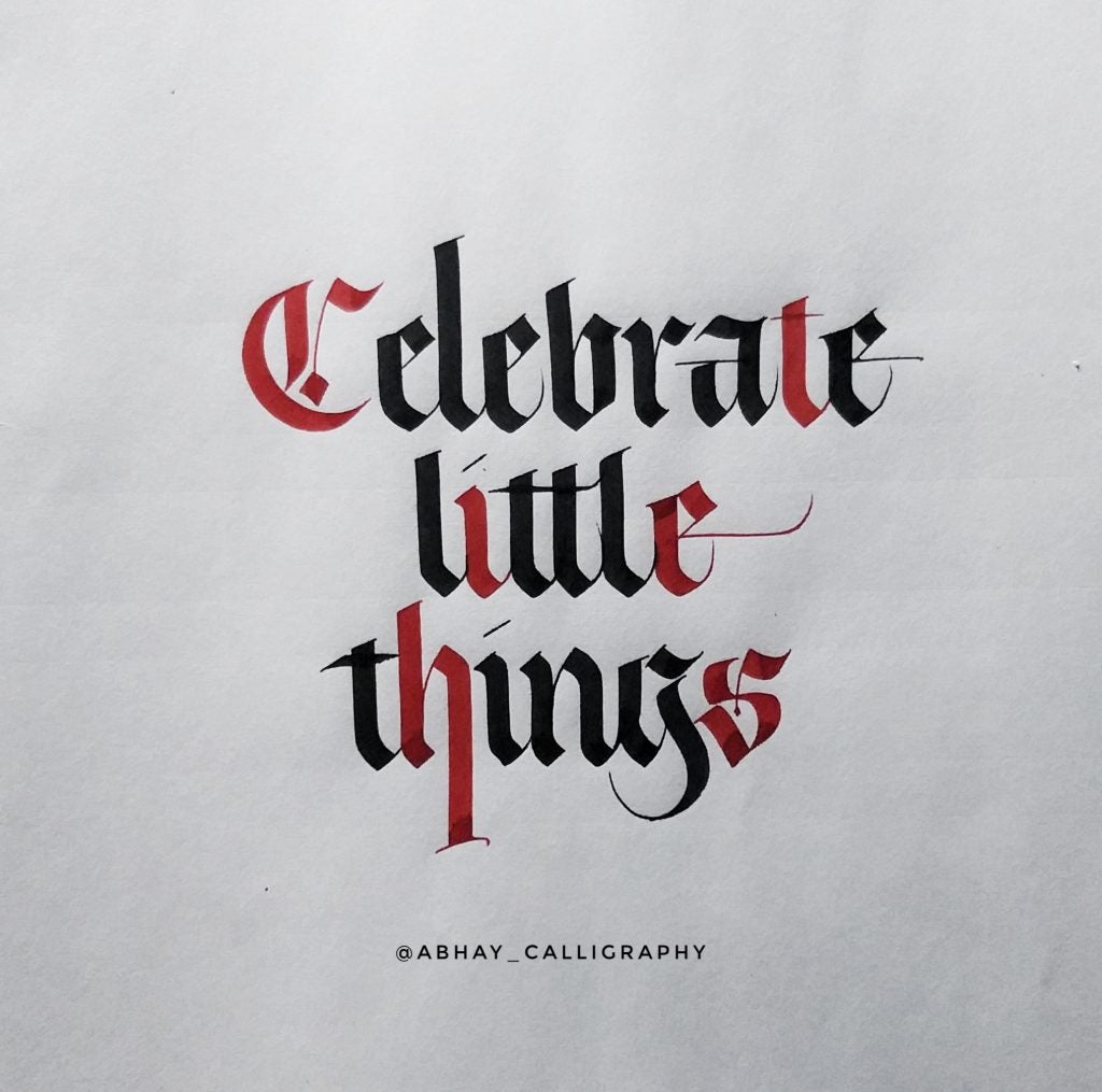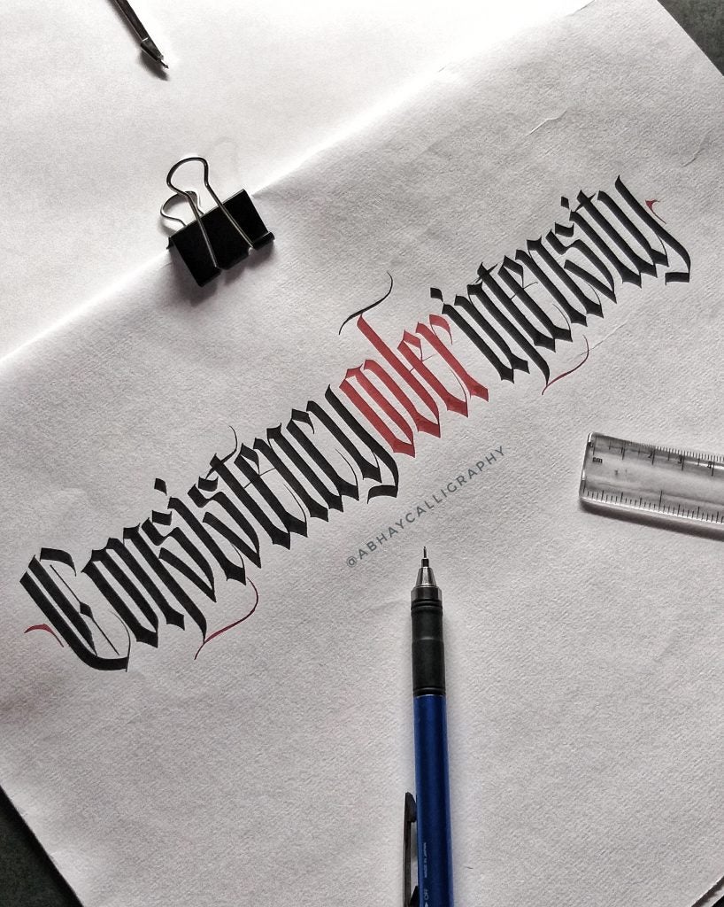 I am Abhay Pratap Singh Rathoud, an engineer turned Calligrapher & Handlettering Artist. I didn’t know anything about calligraphy up until my graduation [when] my friends introduced me to this art. I found it so therapeutic and mediative to watch all calligraphy-related videos and thats’s when I thought of giving it a shot. As usual, I did a lot of research, watched YouTube Videos to get some idea about the tools, scripts, books etc. Some fellow calligraphers definitely helped along the way. Since I was always fascinated with Blackletter, I started with one of the form of Blackletter which was Fraktur. Later, I taught myself Brush Lettering, Italics, Foundational Hand and other scripts.