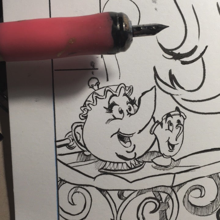 While the breadth of Speedball nibs I have tried are amazing, I am a huge fan of the 512 nib! It is very versatile, from thin lines to bold curves, it does it all. To me, it also keeps a nice bank of ink so I don’t find myself going back and forth to the inkwell. The majority of the pieces show here are done with this nib, either on bristol (100lb) or mixed media paper (140lb) The 512 is a great nib for all skill sets!