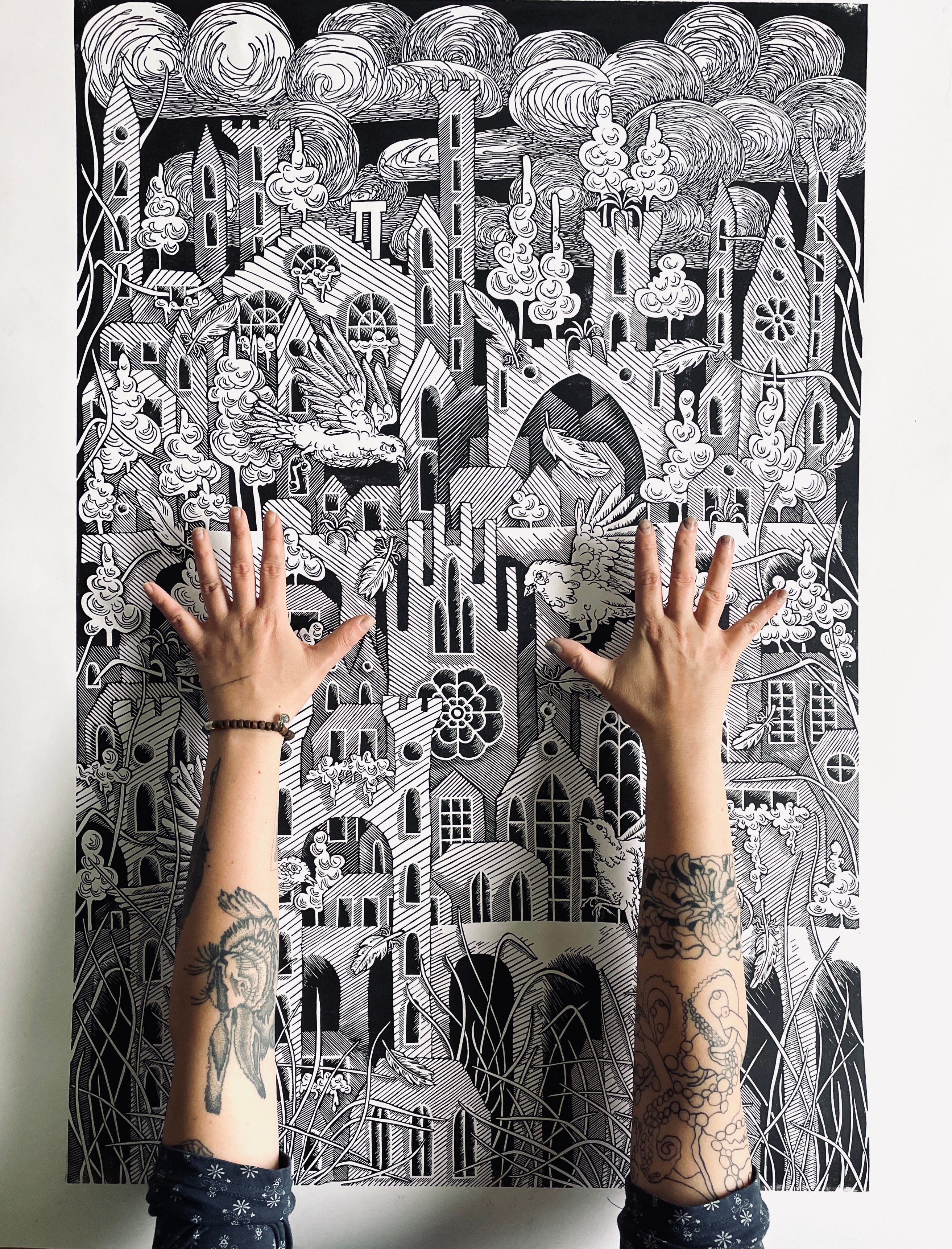 She is endlessly fascinated by the old engraving style of Albrecht Durer but also Hokusai Katsushika and Alphonse Mucha. In 2018 she moved to the United Kingdom, North Somerset, she continues to specialise in plants and architecture, specifically England landscapes, sea monsters and old buildings.