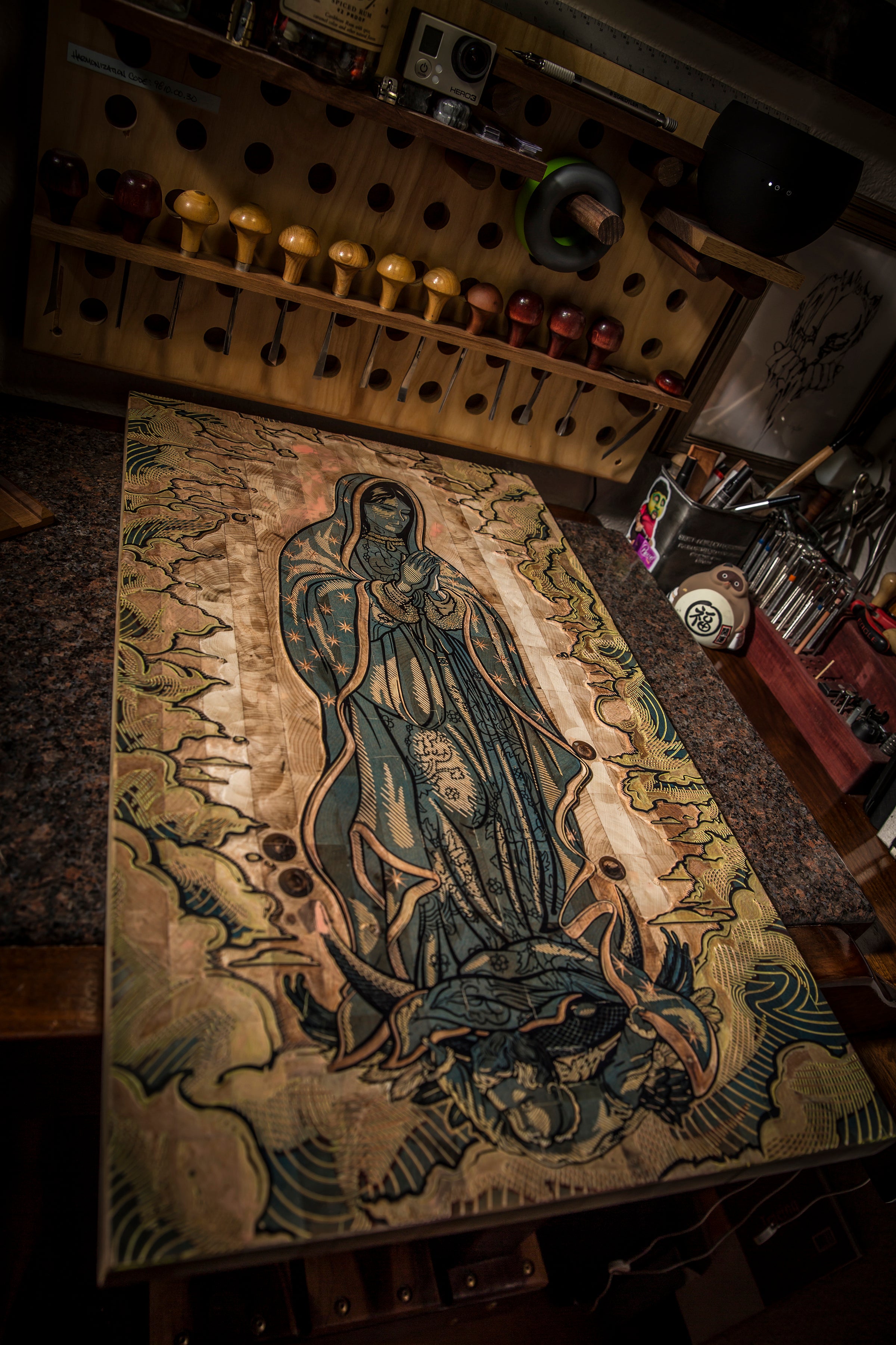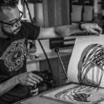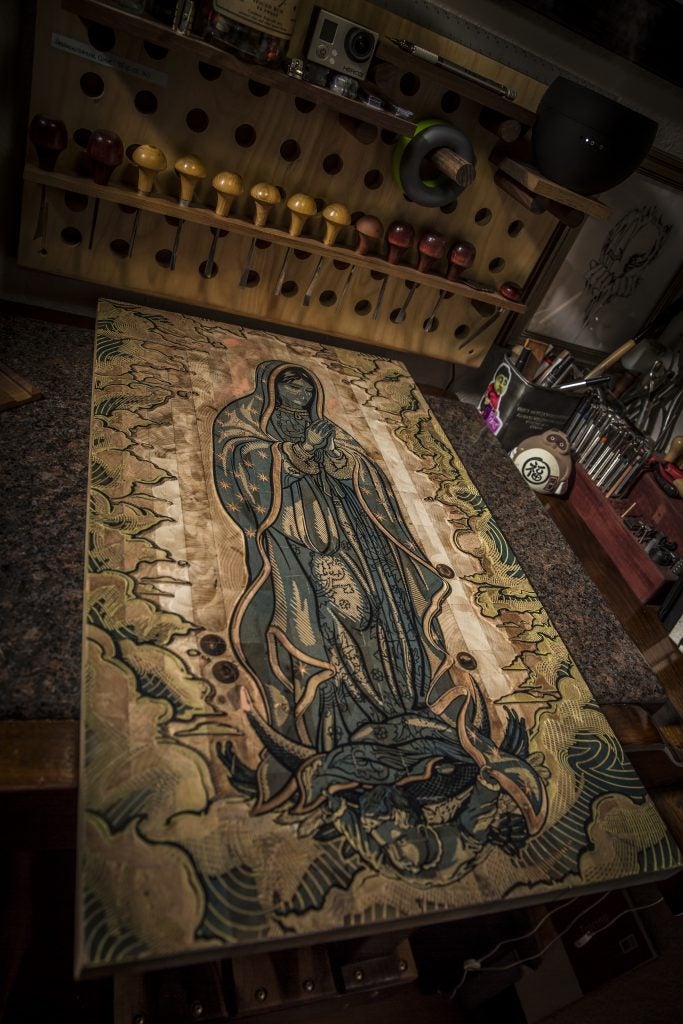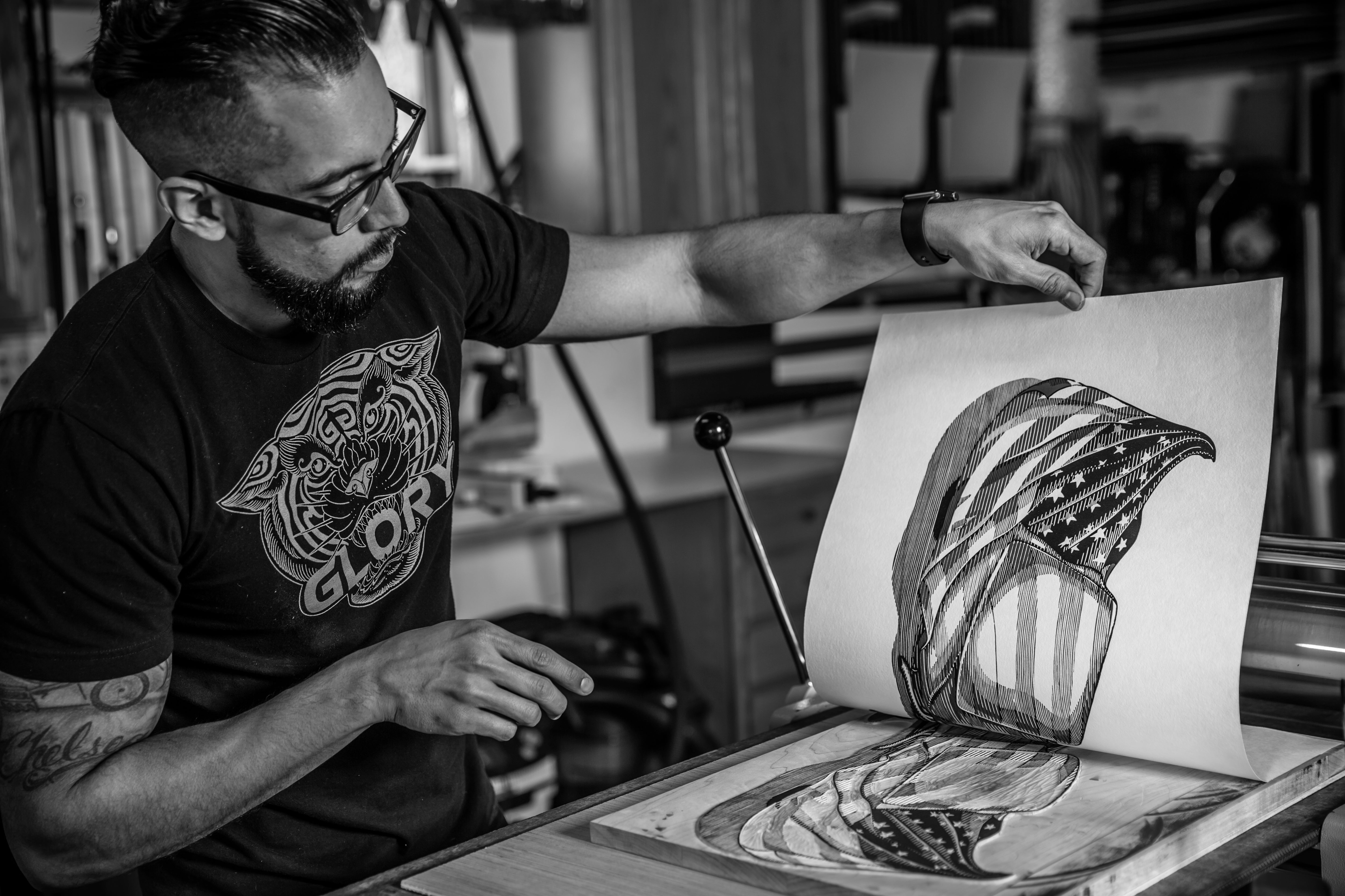 Alex Carmona’s unwavering commitment to the art of printmaking has challenged the boundaries of detail and magnitude; coupled with his determination to educate people on this lost art form. Alex has been given the opportunity to work with several high profile clients such as the Fender Musical Instrument Corporation, Speciality Equipment Market Association (SEMA), and Kremer Racing Team in Germany. His collaboration with Fender created the world’s first hand carved “Woodcut Telecaster.”