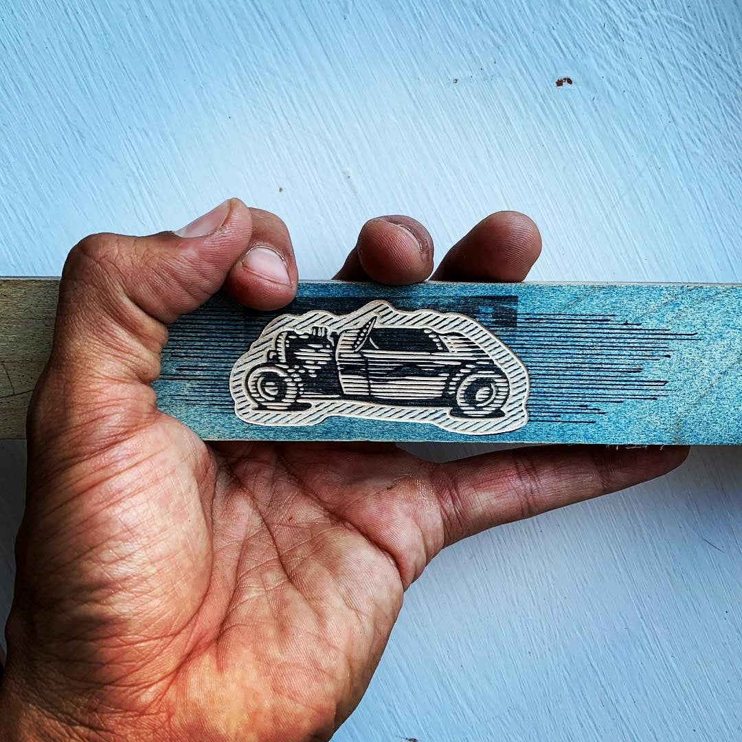 Petrol-fueled machines. My obsession with automobiles matches my obsession of art, family, and country. Carving elegant lines into a hand made woodblock and always trying to push the limits of detail and scale, my woodcuts are a representation of my love for an industry that is rooted in competition. Using razor sharp carving tools, I explore new ways to create values through patterns of lines. A singular line stands frail and alone, but a group of lines working together can create vast variations of dark and light.
