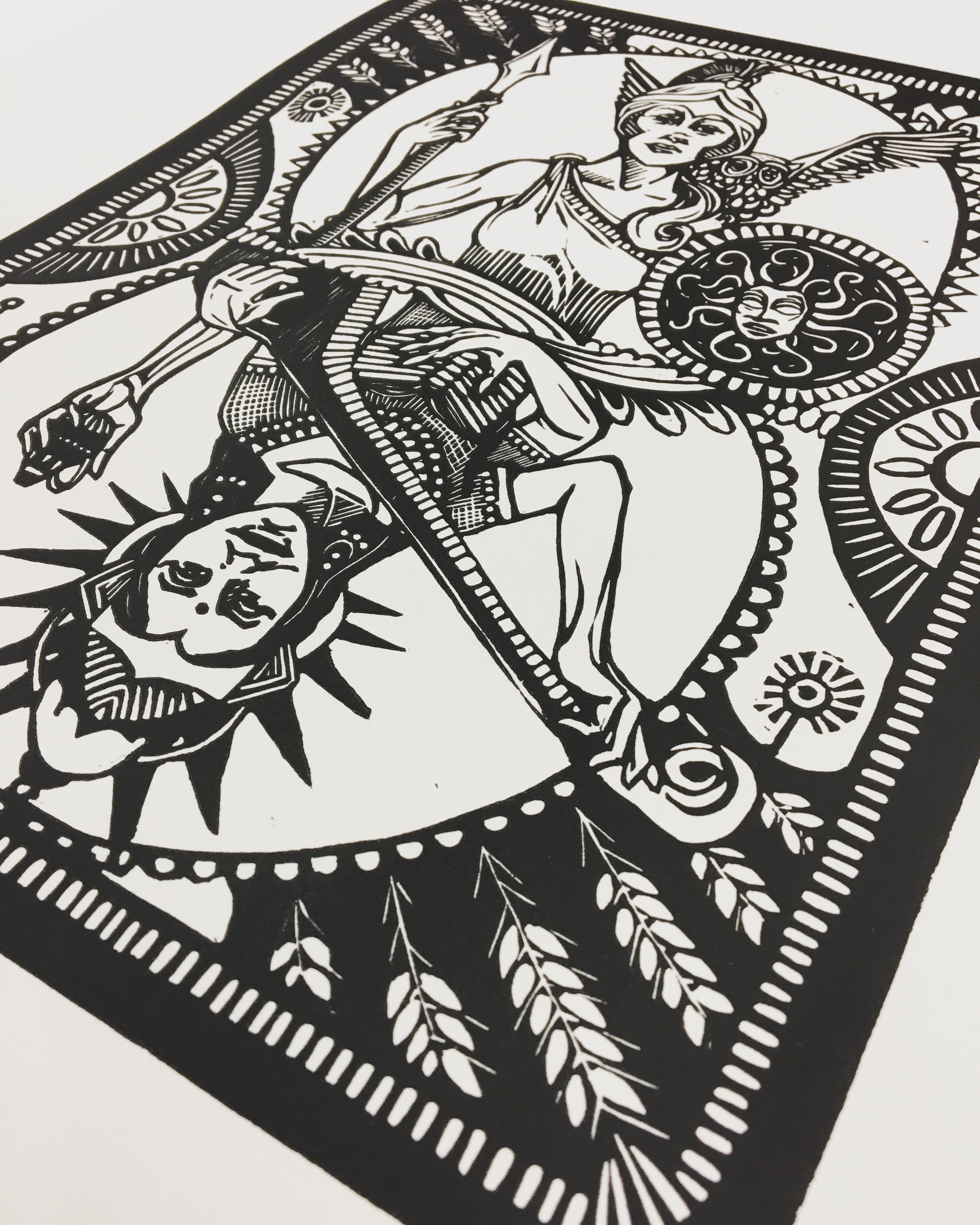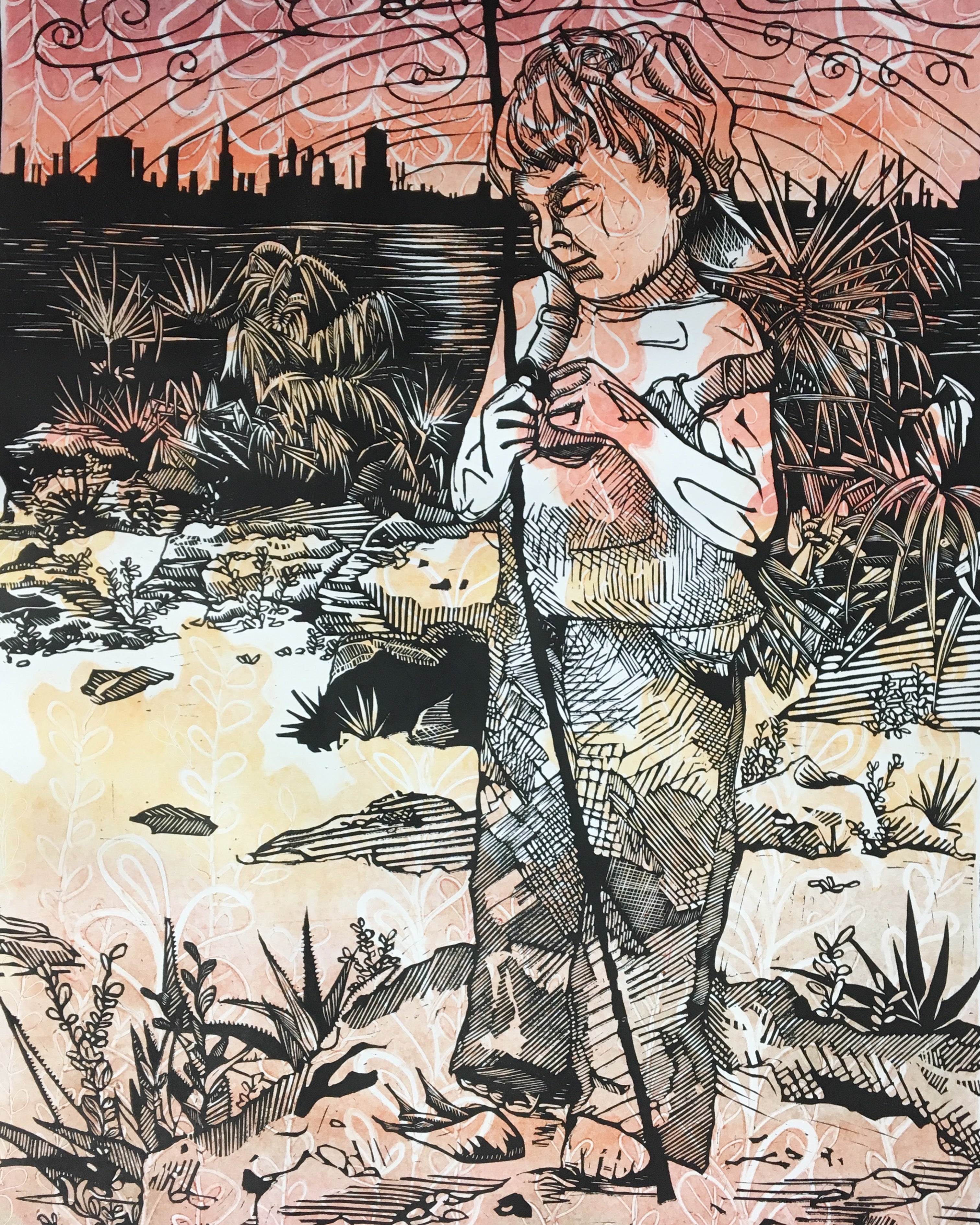 Amber Kaiser lives and works in Houston, Texas. Having a sculpture background, Kaiser feels printmaking was a natural direction to go in with the three-dimensional quality of printmaking techniques. As a member of Burning Bones Press, she has learned and created with many talented artists throughout the past 6 years. Kaiser’s art focuses on the human figure and their environment, whether physically or culturally. She is an avid traveler and has conducted print demonstrations internationally as well as participated in international residency programs. Lino cut has been her primary medium, but also enjoys etching, and clay work. Kaiser is usually found either conducting a local workshop, at BBP or her home studio.