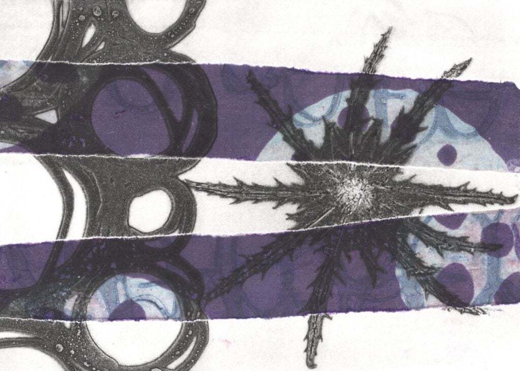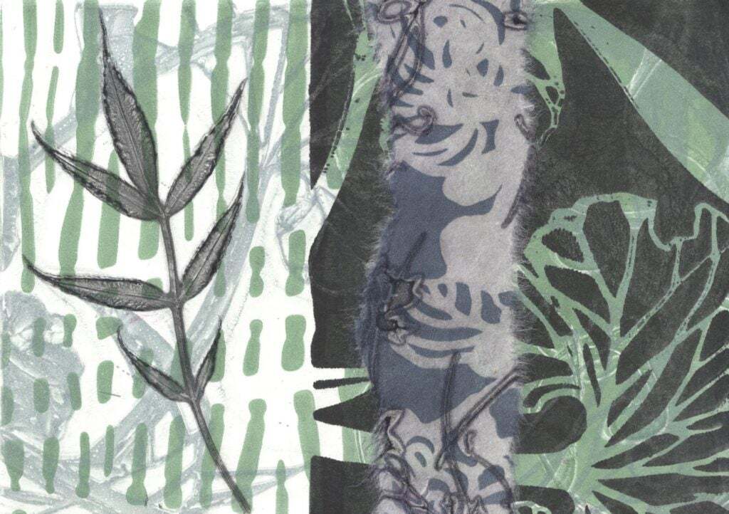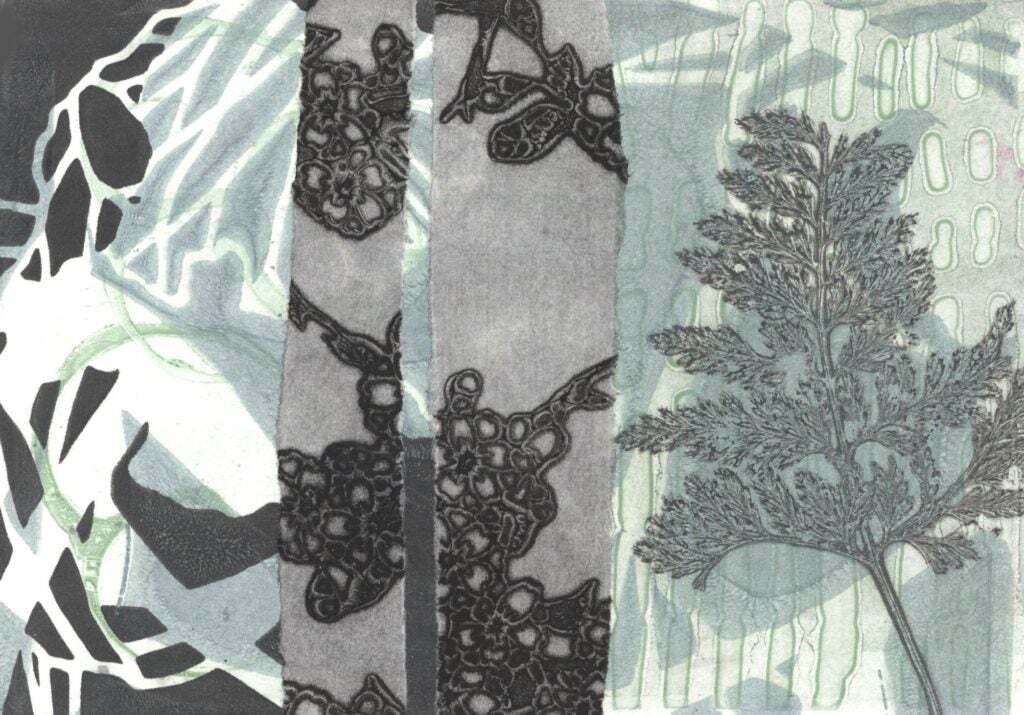 After a chance experience filling in for a fellow printmaking instructor for the annual Nature Printing Society workshop series, Nack became deeply interested in nature printing using the Speedball Gel Printing Process. She combines nature’s bounty, artifacts, detritus, and stencils with personal relics to create her multi-layered prints and teaches her process throughout the United States.