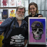 We work almost exclusively with Speedball Acrylic Screen Printing Inks for printing on paper, wood, leather and other graphic items and LOVE it for live demos, indoors and outside. We like the fact it prints good detail, it doesn’t dry in quickly, and can be easily cleaned with soapy water. In the studio, we print a lot of shirts, and we use Speedball Screen Printing Fabric Inks, and the pearlescent [Opaque Screen Printing Inks] line. We work with a lot of kids, and it’s perfect for them to learn with – if they get inky (which we all do!), it washes off with water.