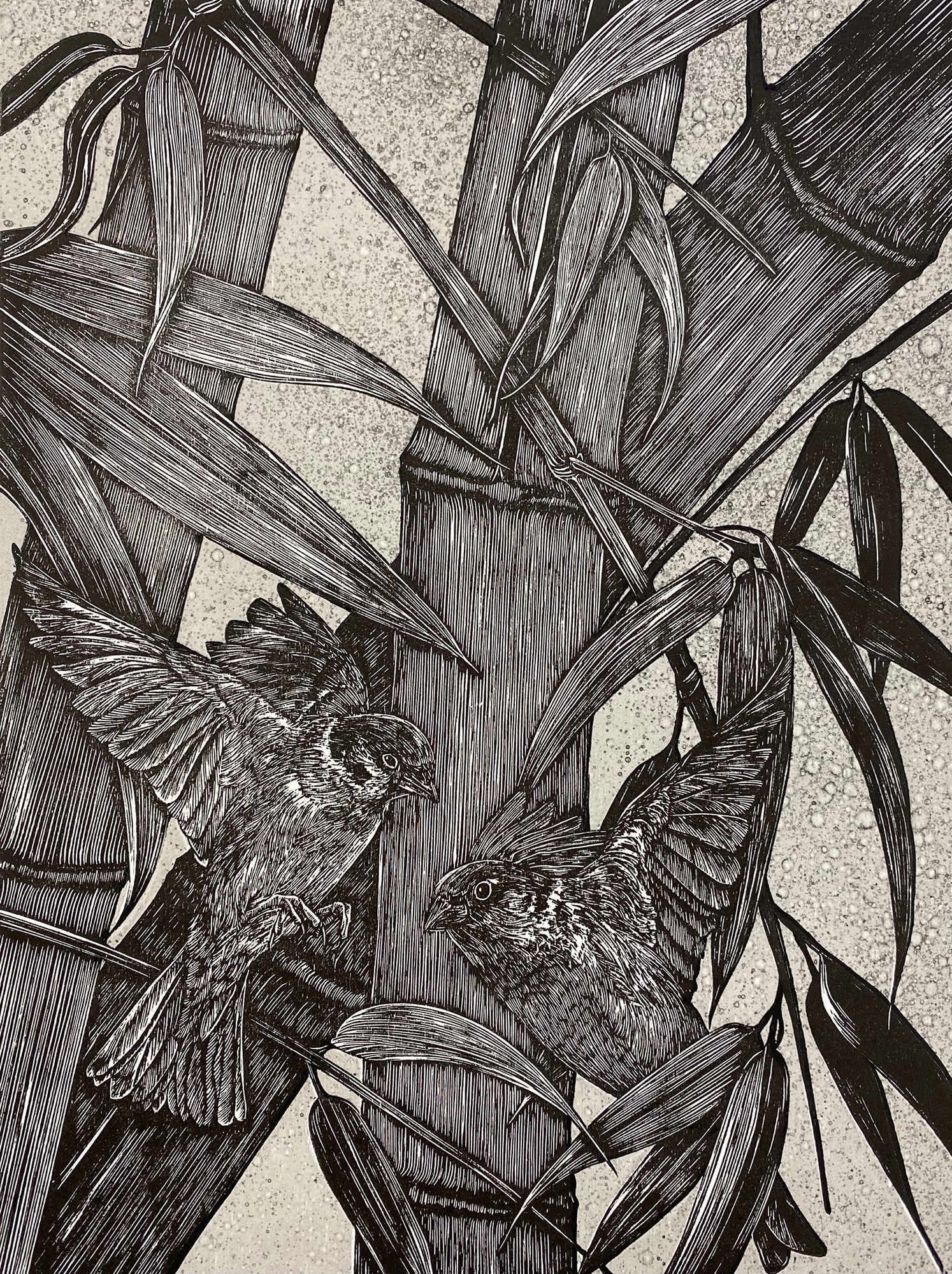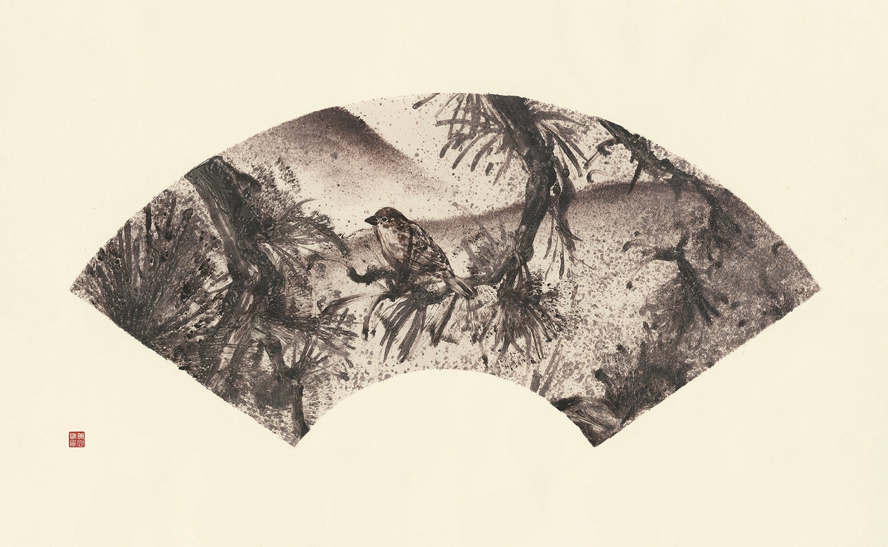 Huang’s artistic creation is profoundly influenced by Chinese flower-and-bird paintings, which depict nature’s beauty, often conveying symbolic meanings, mostly reflecting a yearning for happiness and harmony. For instance, magpie heralds fortune and happiness, bamboo implies integrity and career advances, and orchid represents nobleness and modesty. Birds are chirping under the tree canopies, insects perching on flowers, and fish leaping out of a creek—each element is incomplete without its environment. The sum of and the interaction between these elements create a sense of wholeness and harmony. He attempts to capture and frame these moments in his art works.