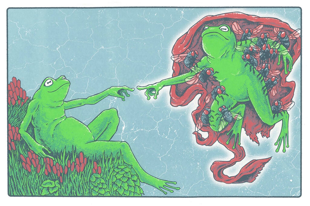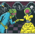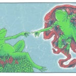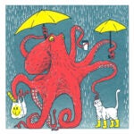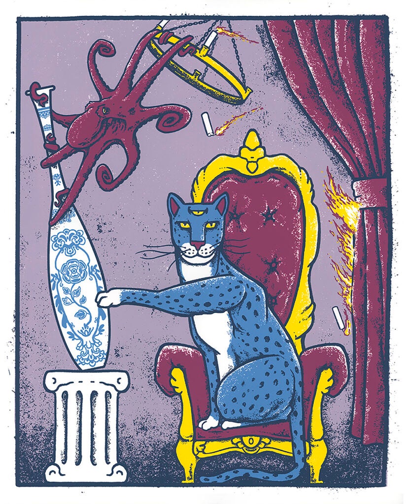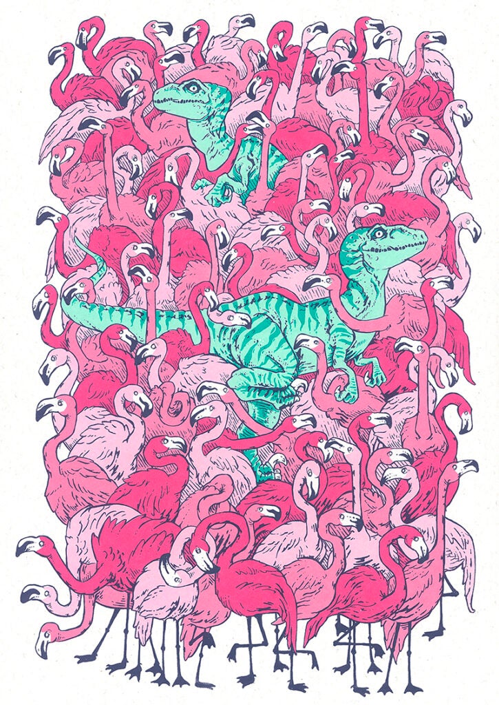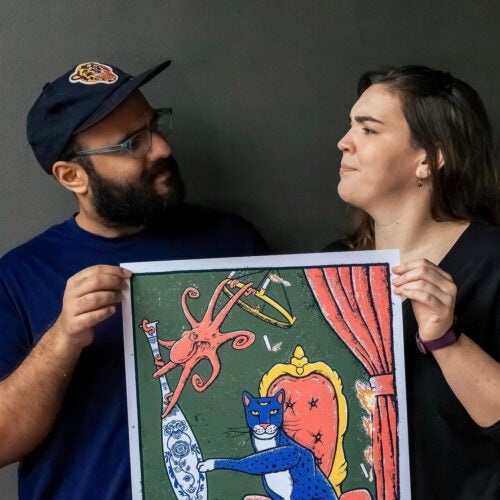 Abbas Husain and Noreen Walls are a duo of printmakers based in Chicago, working under the name Bagman Studios. Abbas is an illustrator, creating original designs, both traditionally and digitally. Noreen left her job in 2021 to join Abbas in printmaking and managing the business. Their entire printmaking process is done by hand, including mixing custom colors of Speedball acrylic ink. Their art is light-hearted and focuses on pleasing combinations of creatures and colors. Abbas and Noreen are passionate about sealife, art, and most of all, their cat Cleo.