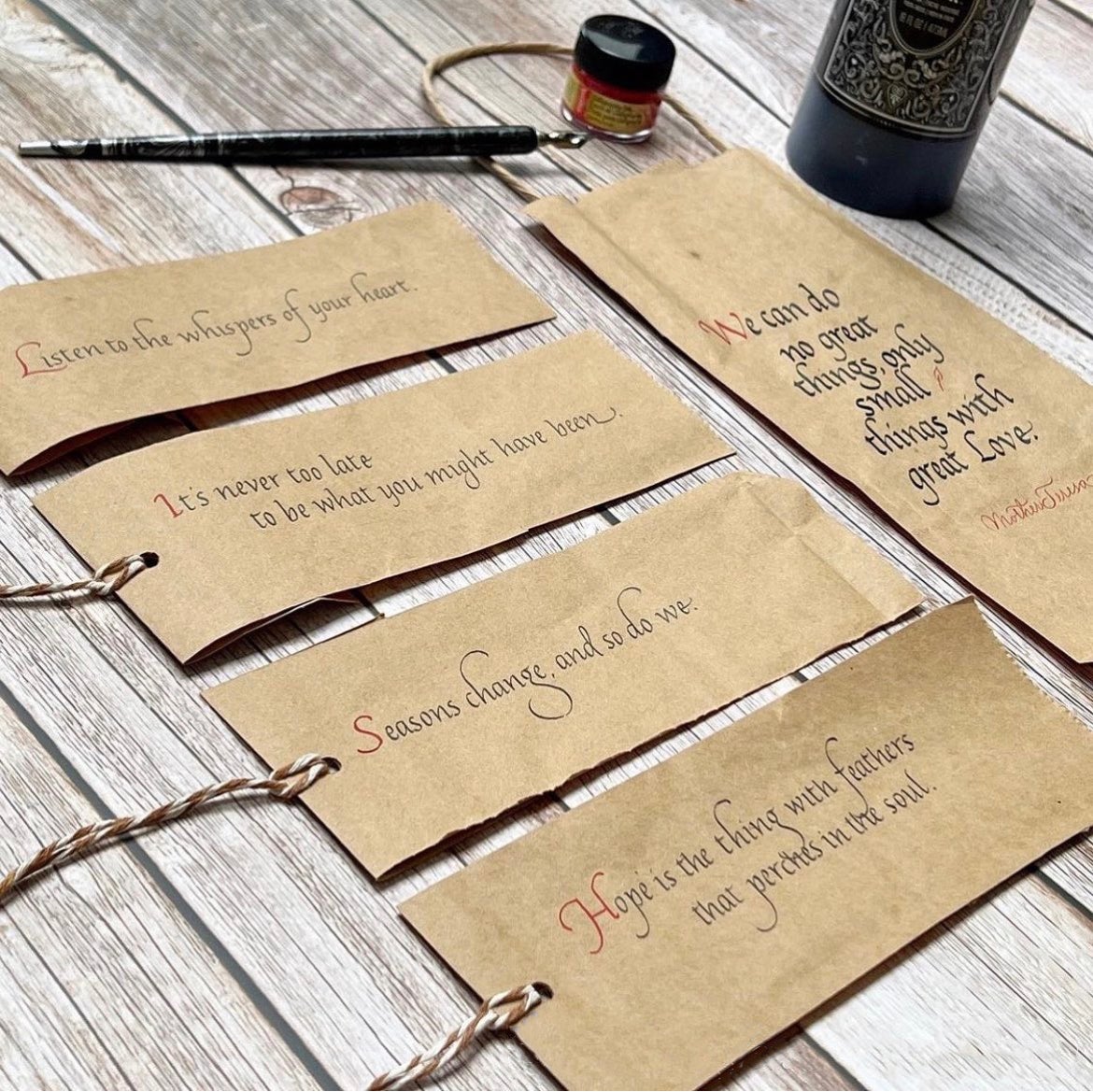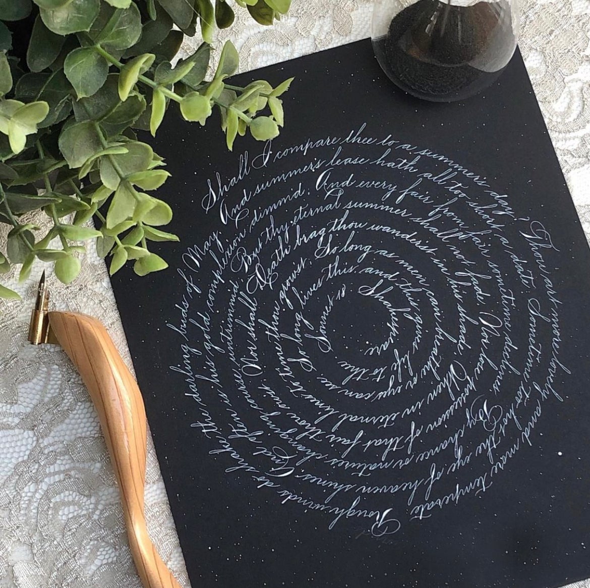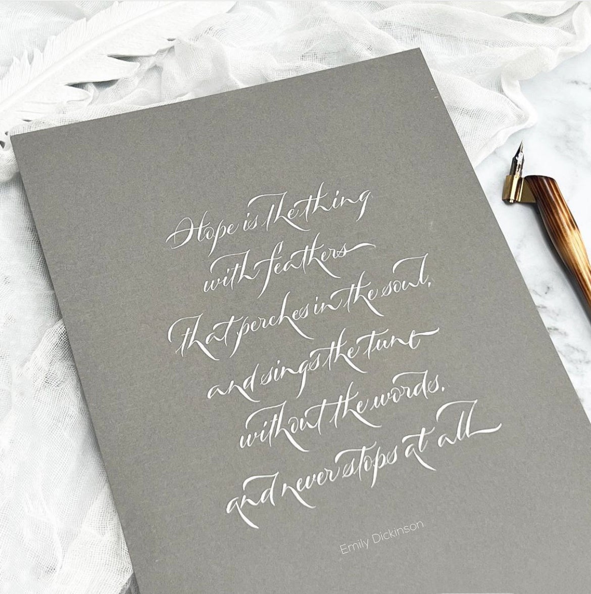 When she’s not doing calligraphy, she enjoys reading, cooking, writing letters, photography, bookbinding and crochet.