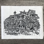 I hadn't printed a block in, I don't know, 8 years or so. I got the itch to carve something one day and needed to get paper and ink. I picked up a can of Supergraphic Black and fell in love. I set my studio up on as small of a budget as possible, most of my supplies I buy at the dollar store, the wood I've been carving came was going to be thrown in the trash and a lot of the paper I've been using has been sitting around for years. I guess I made a decision to try to be as sustainable as possible in my studio and not having to use anything harsher than water and dish soap to clean up makes it even better. As far as imagery, I'm all over the place, for me this is about communicating and healing. I'm referencing magical images and spiritual icons, exploring ways to help others feel connected to protection, healing and a universal energy. The world has gone crazy and anything that helps me feel better I hope to share with others. I've also been making these prints and drawings of clubhouses and stores, they're all made up but refer to places that exist. The buildings tend to be pretty ramshackle, made out of plywood and trash, covered in graffiti and ridiculous signs that warn trespassers and police to stay away. I find them intimidating but comforting... if you aren't here for fun go home.