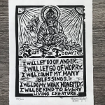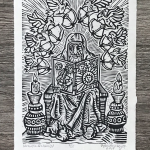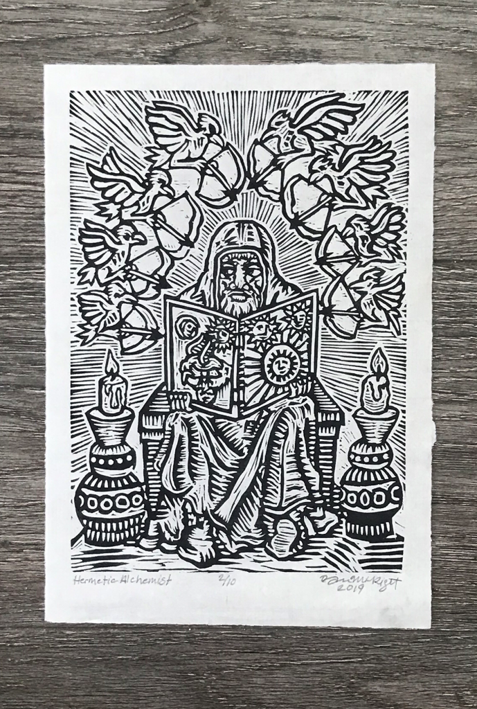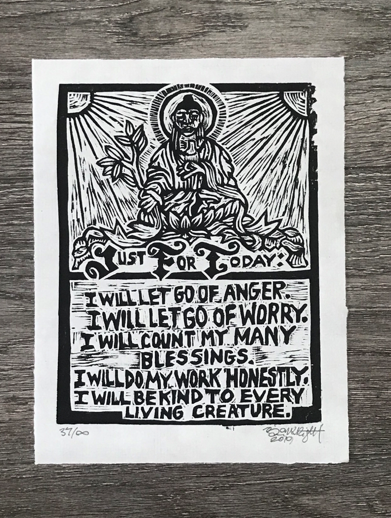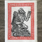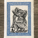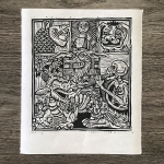 Bill lives in Los Angeles with his wife and cat. He makes his work at his home studio, a small backyard shed, his living room and front porch. Recently returning to block printing after an extended break he is amazed to see how far ink has come in that time. Besides making prints, Bill also engraves metal, makes drawings and sculptures, collects crystals and practices Reiki.
