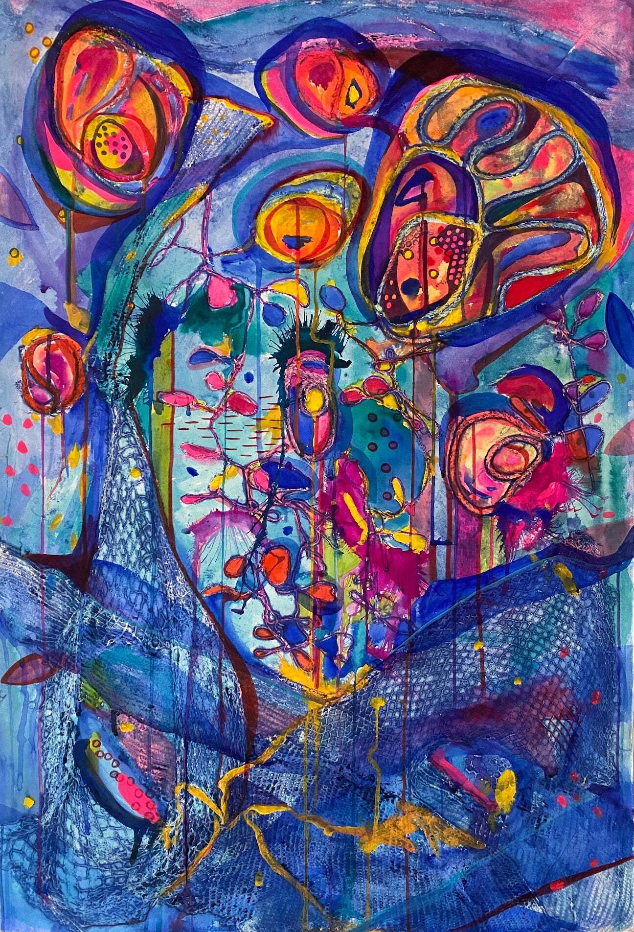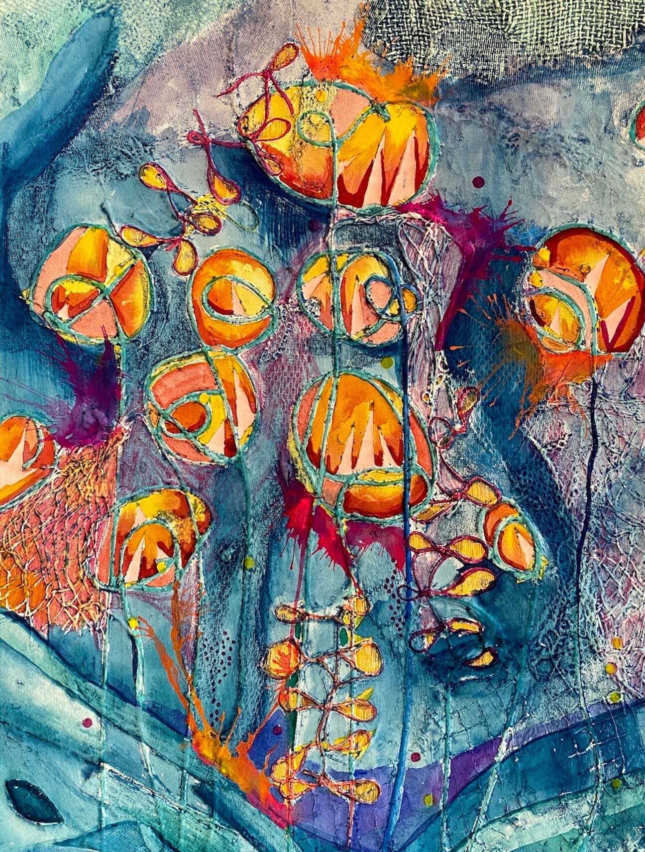 I am a professional printmaker and painter and lover of nature and found objects. While our throw-away society continues to pollute the planet, I use discarded textured materials, shapes, and objects to evoke the wonders of nature. In some of my work, I use the very materials that are choking the ocean (such as string and plastic netting) to illuminate the ocean’s fragile beauty.