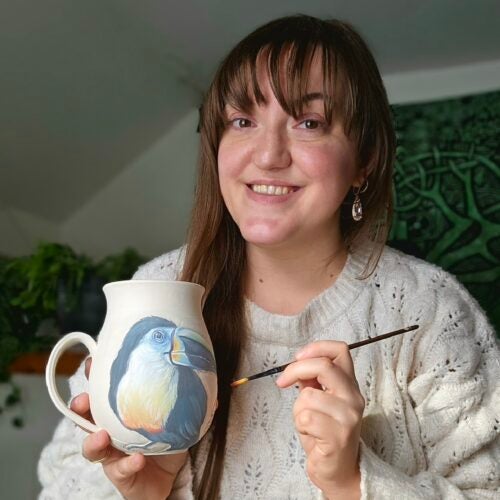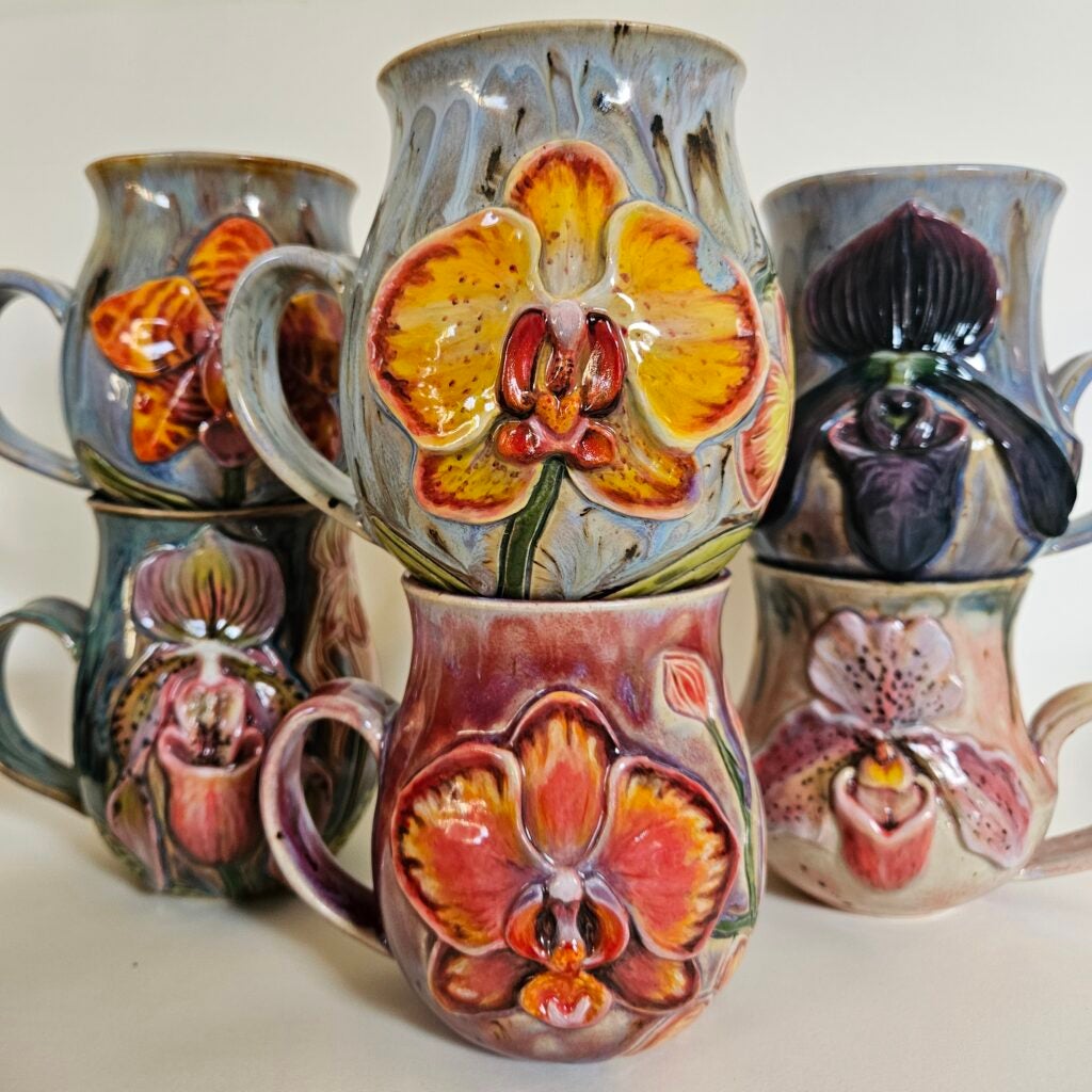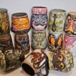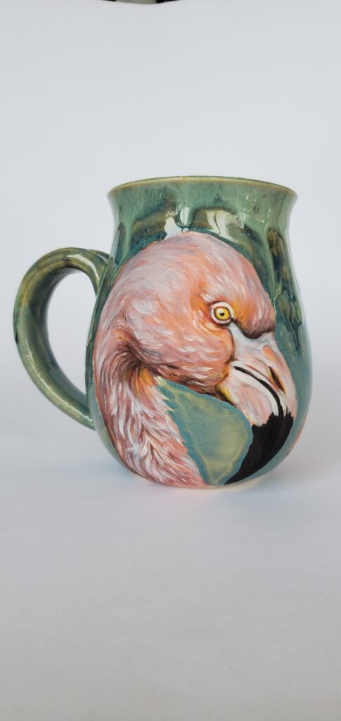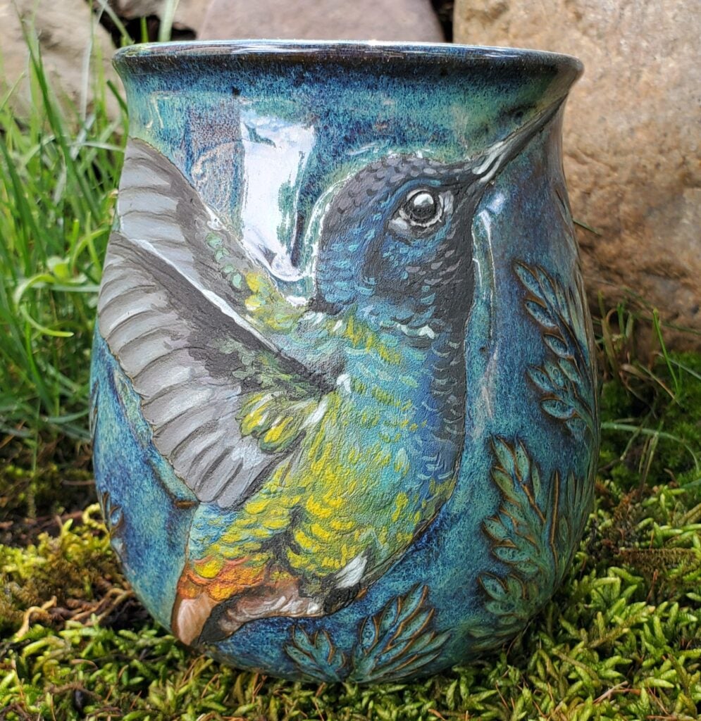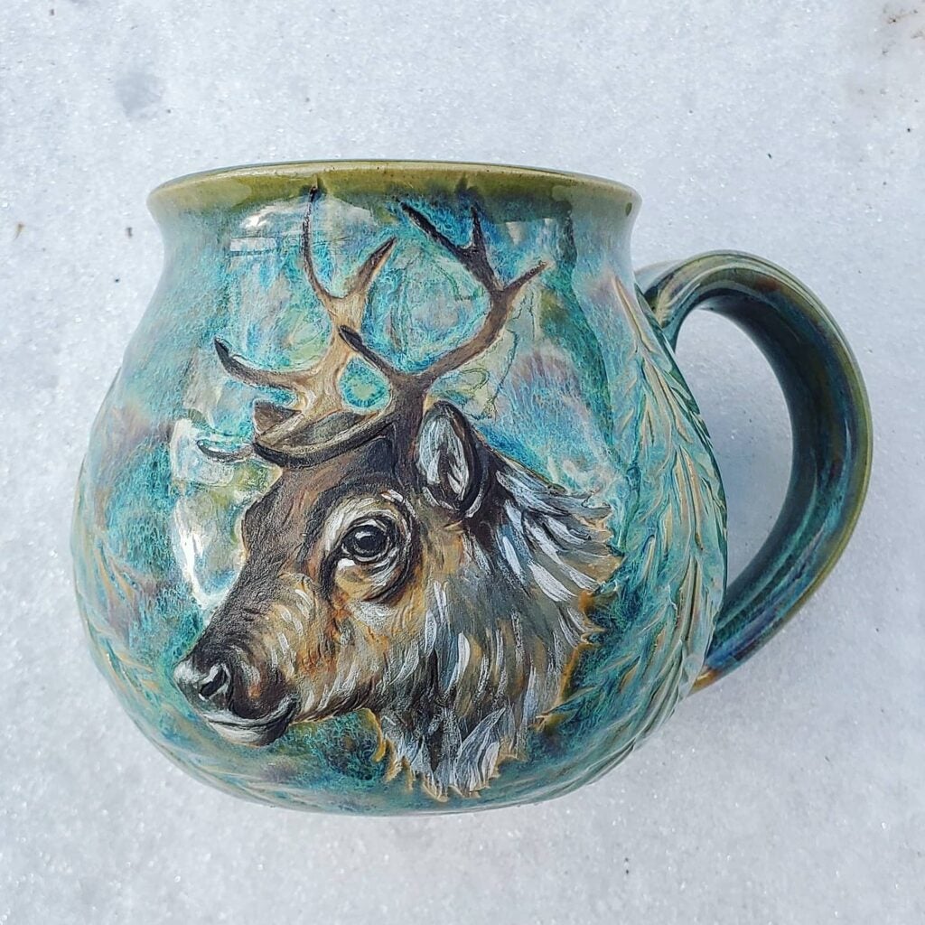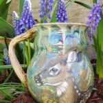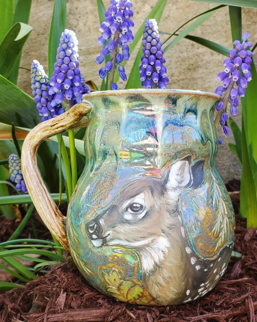 My work consists of throwing on the wheel, hand building, carving and painting with underglazes. My inspiration comes from the natural world. Growing up I was taught to respect the great outdoors and never take more than you need. My work is meant to help others acknowledge their connection with nature. Not only is the pottery held in your hands, but the animal’s fate is also in our hands. As you pause for a moment of gratitude while you sip your drink from one of my painted or sculpted mugs, you’ll admire the image and remember nature is a part of you. We need to be thankful for all that it gives and find ways to give back.