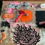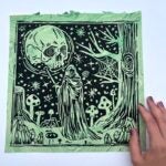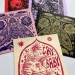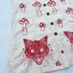 As for their hand printed clothing, they love to up cycle thrifted and vintage clothing by designing and carving stamps to print with. All designs are hand carved, then hand printed onto clothing and fabrics, making each item a unique, wearable work of art.