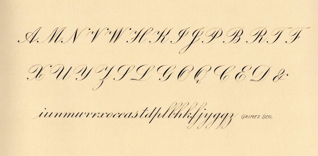 When he isn’t producing penwork in his Portland, Oregon studio or teaching students about the Grimes Method of Engrosser’s Script, David is an avid collector and conservator of penmanship ephemera. He offers many public domain books as free downloads from the Archive section of his website.