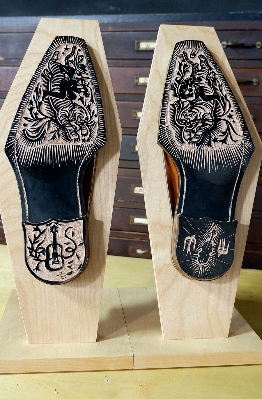 The shoes collaboration with Noriyuki Misawa was most recently in a group exhibition at Isetan in Tokyo. Noriyuki Misawa designed and made a pair of oxfords that were measured off Kilpatrick’s feet, and Kilpatrick carved relief into the leather soles of these shoes. The theme of the collaboration was “music”, and the carving on the soles of this pair of shoes reflects this theme. These shoes act as both the woodblock and the weight of the human body acts as the printing press.