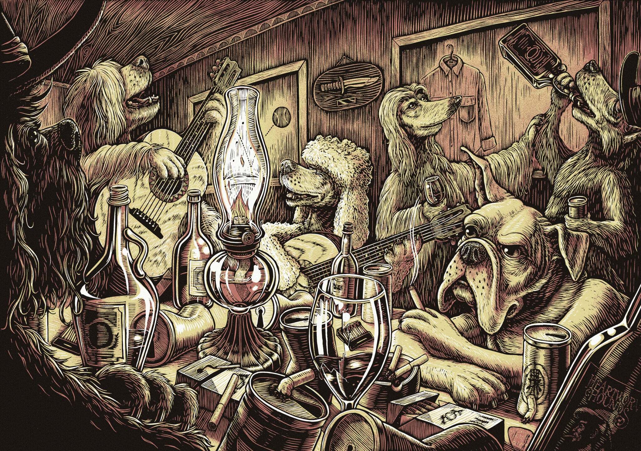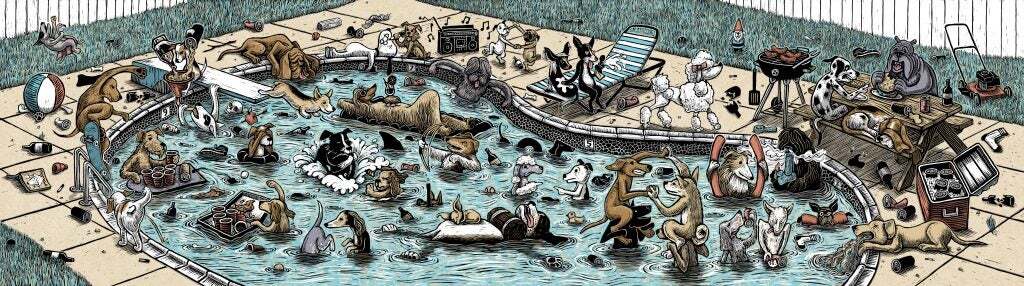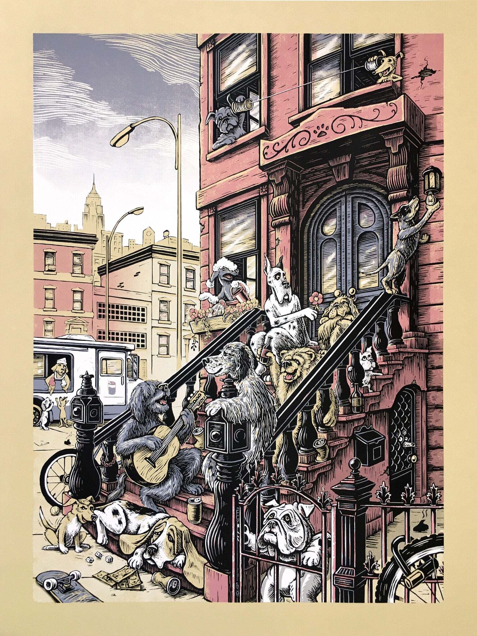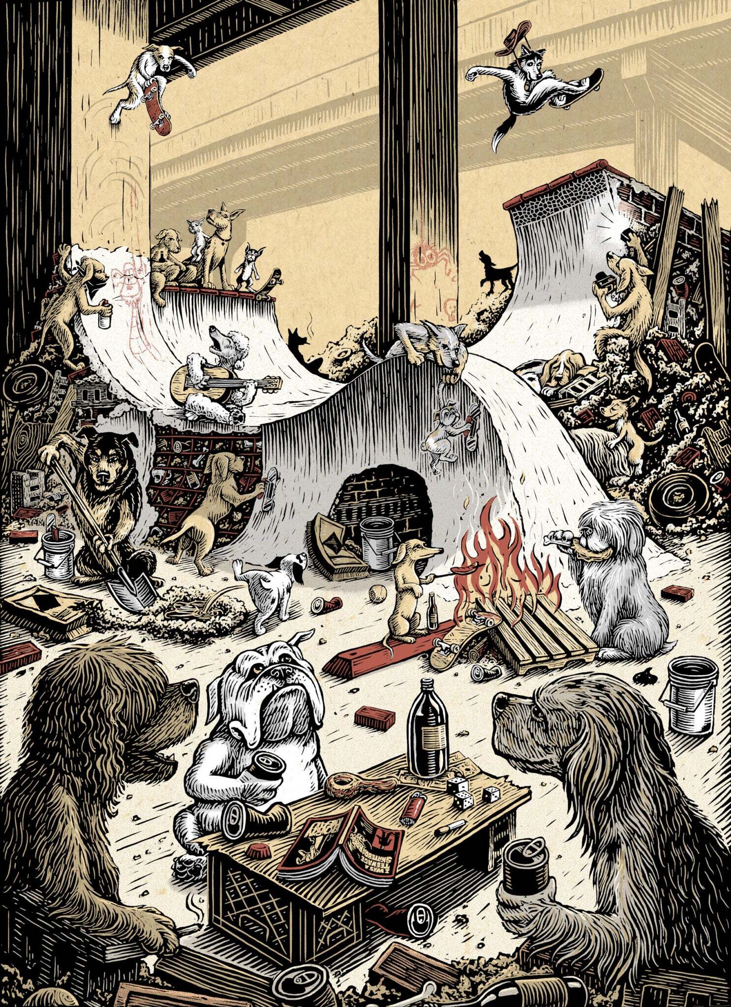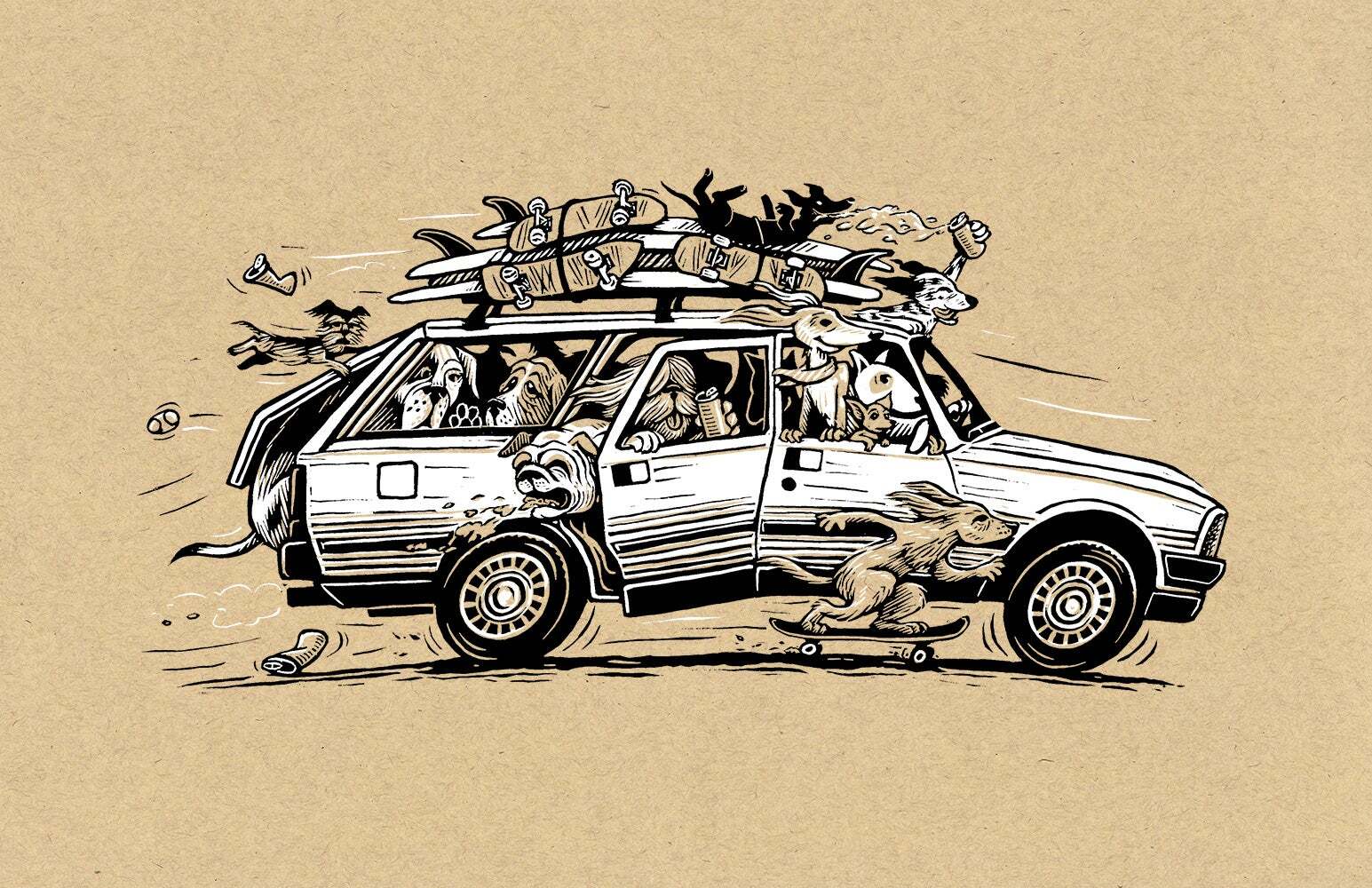 His work is characterized by rich detail and texture and regularly features anthropomorphized animals in humorous scenes. His love of dogs and skateboarding are notable themes and present in his self-published alphabet book, See Spot Shred, released in 2015. He has collaborated with notable retailers such as Vans, Deathwish Skateboards, and Rome Snowboards and publications such SF Weekly, The Portland Mercury, and Thrasher Magazine.