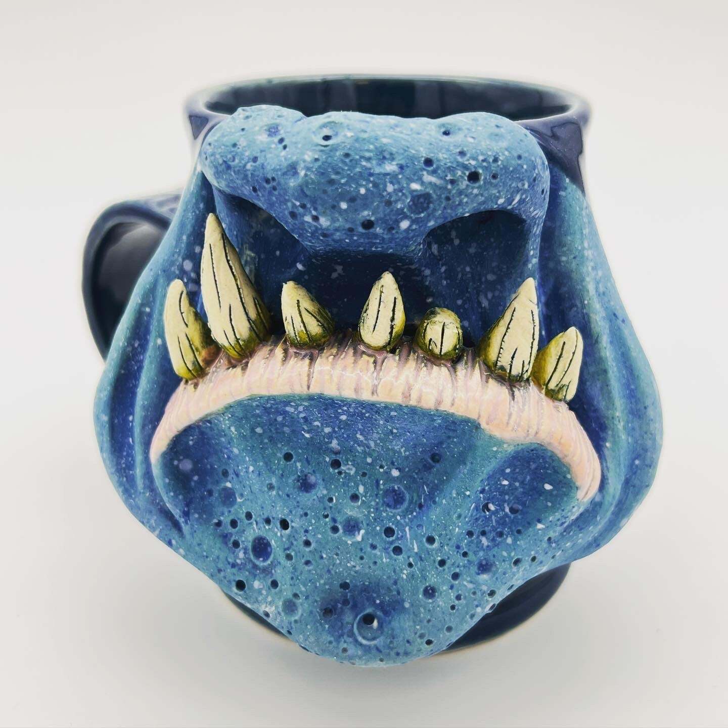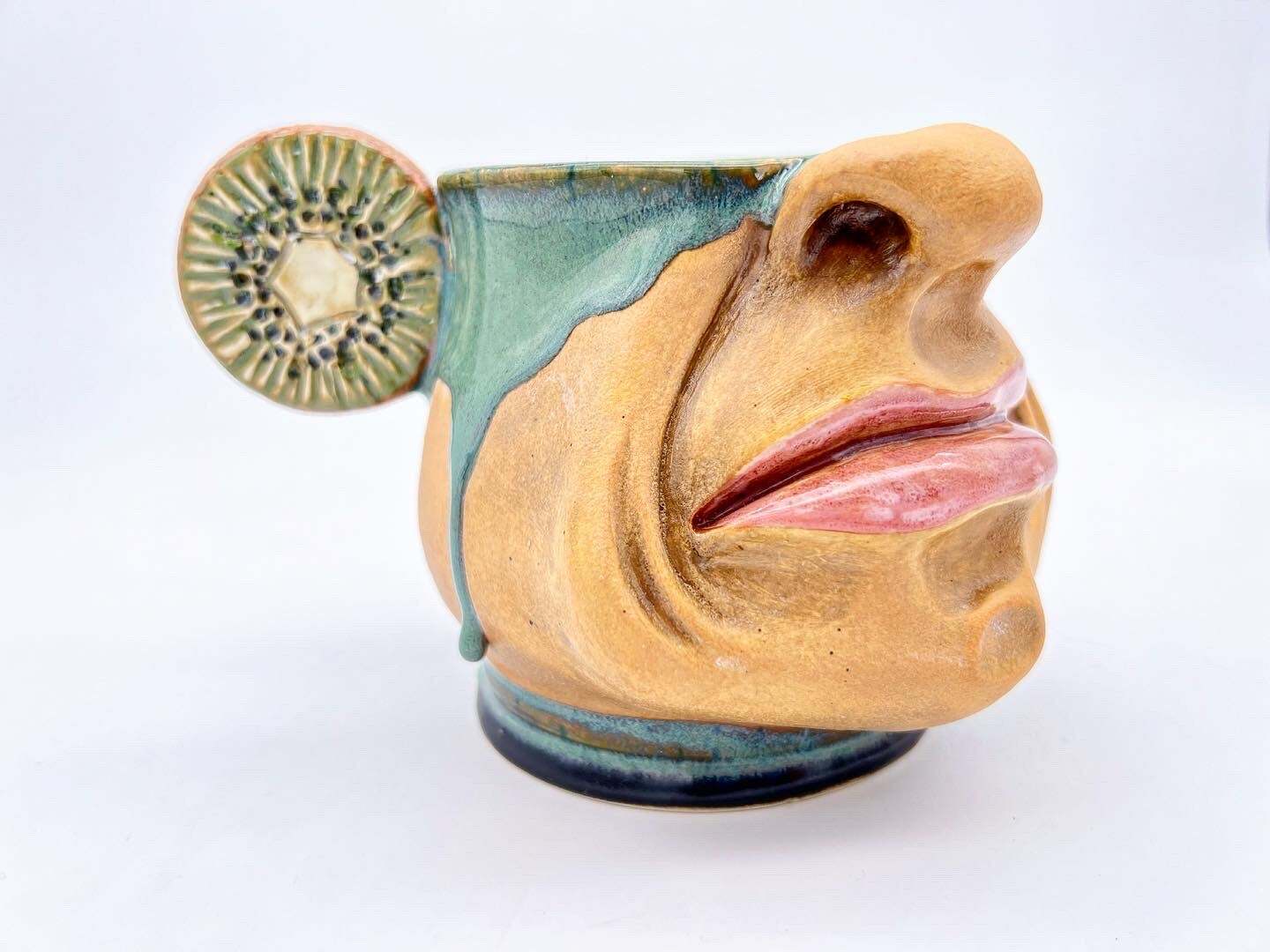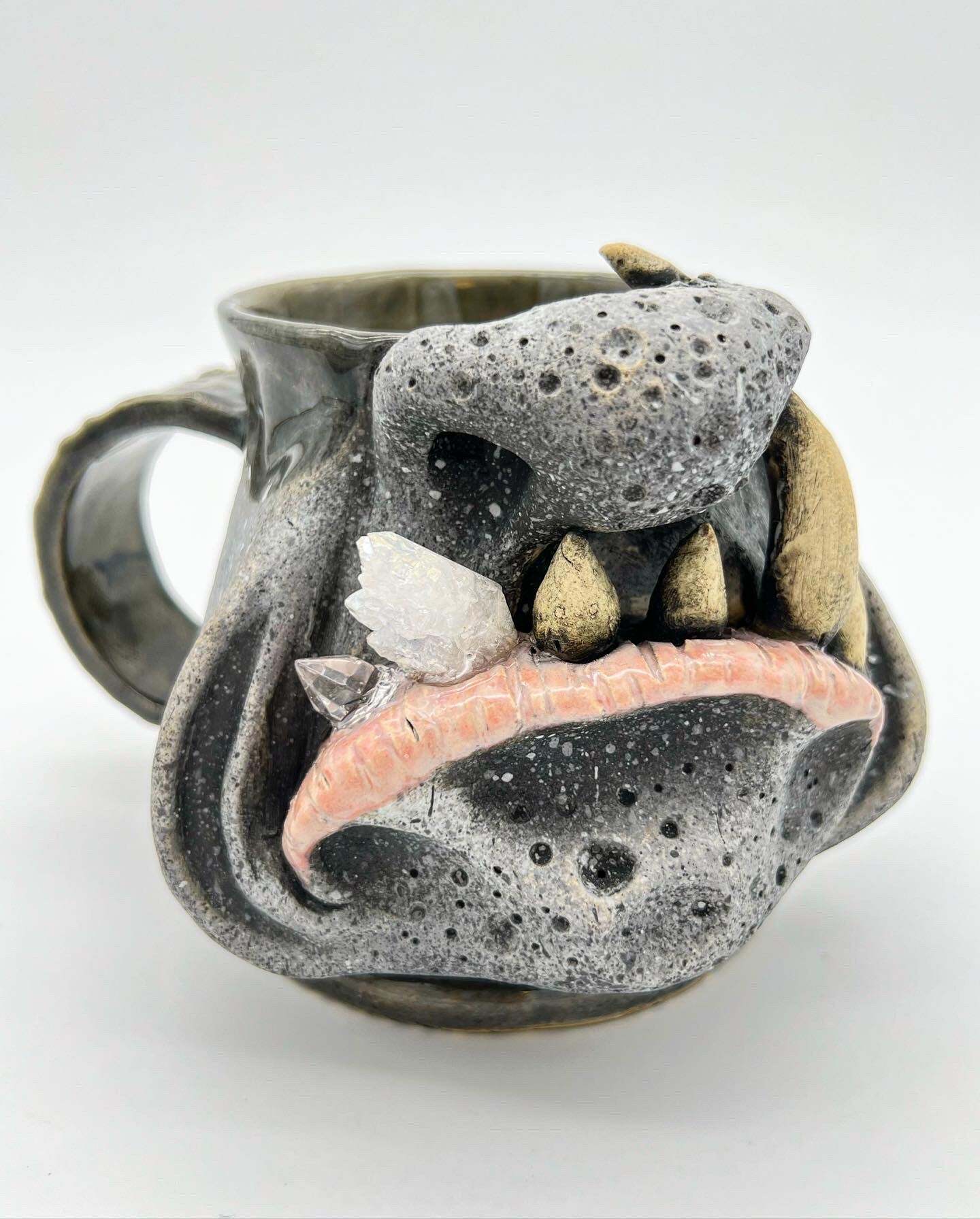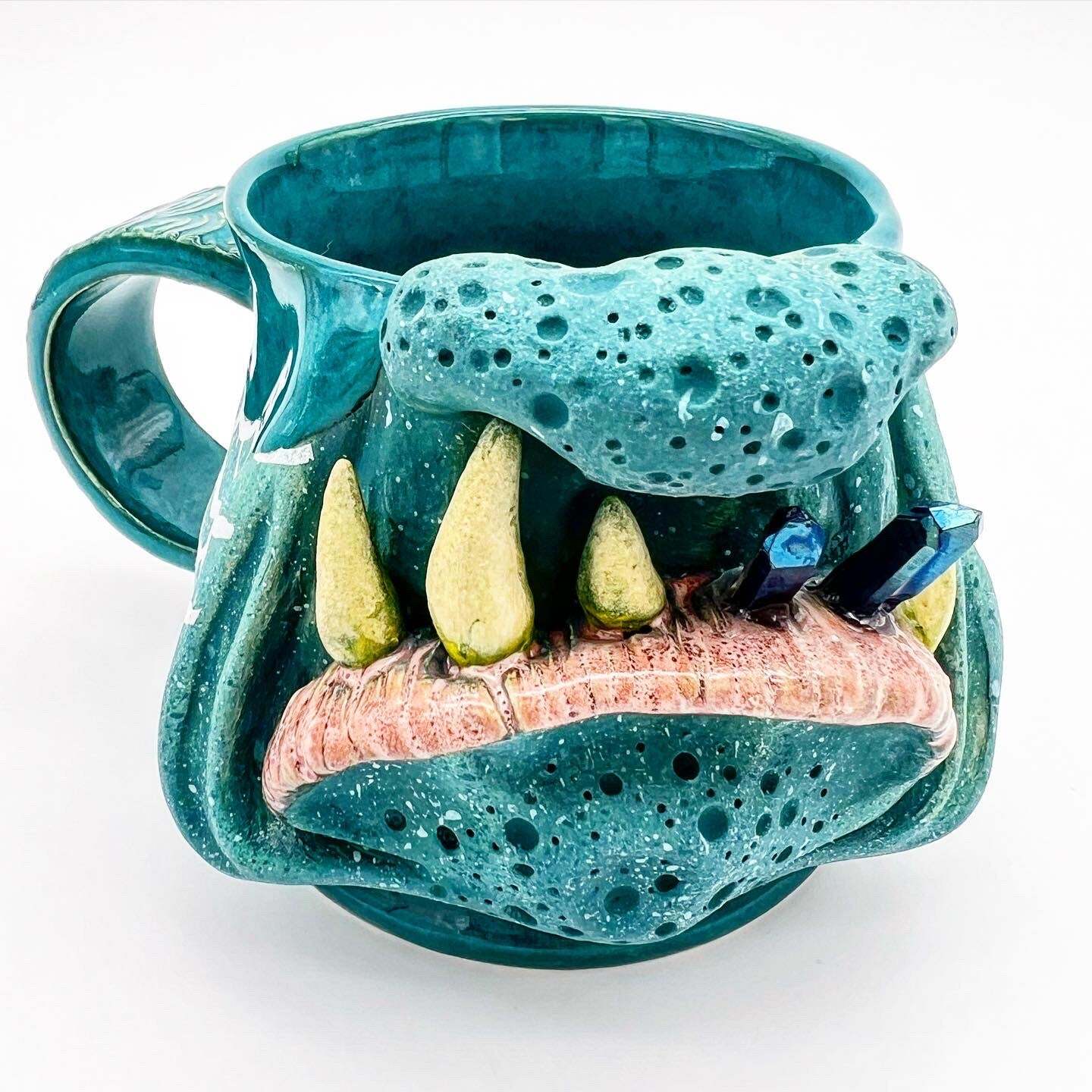 My work falls into the sculpturally altered, wheel thrown pots category. Or as they are popularly known – face pots, mugs or jugs. I love the endless possibilities of faces and the characters they embody. I make them so that the owner can become a part of that character while drinking from my mugs. I hope to make people stop and think or smile with my pottery. I use a variety of underglazes, glazes, crystals and resins to bring my ogres to life. I work in a white mid range stoneware, and I’m constantly looking for new faces to make!