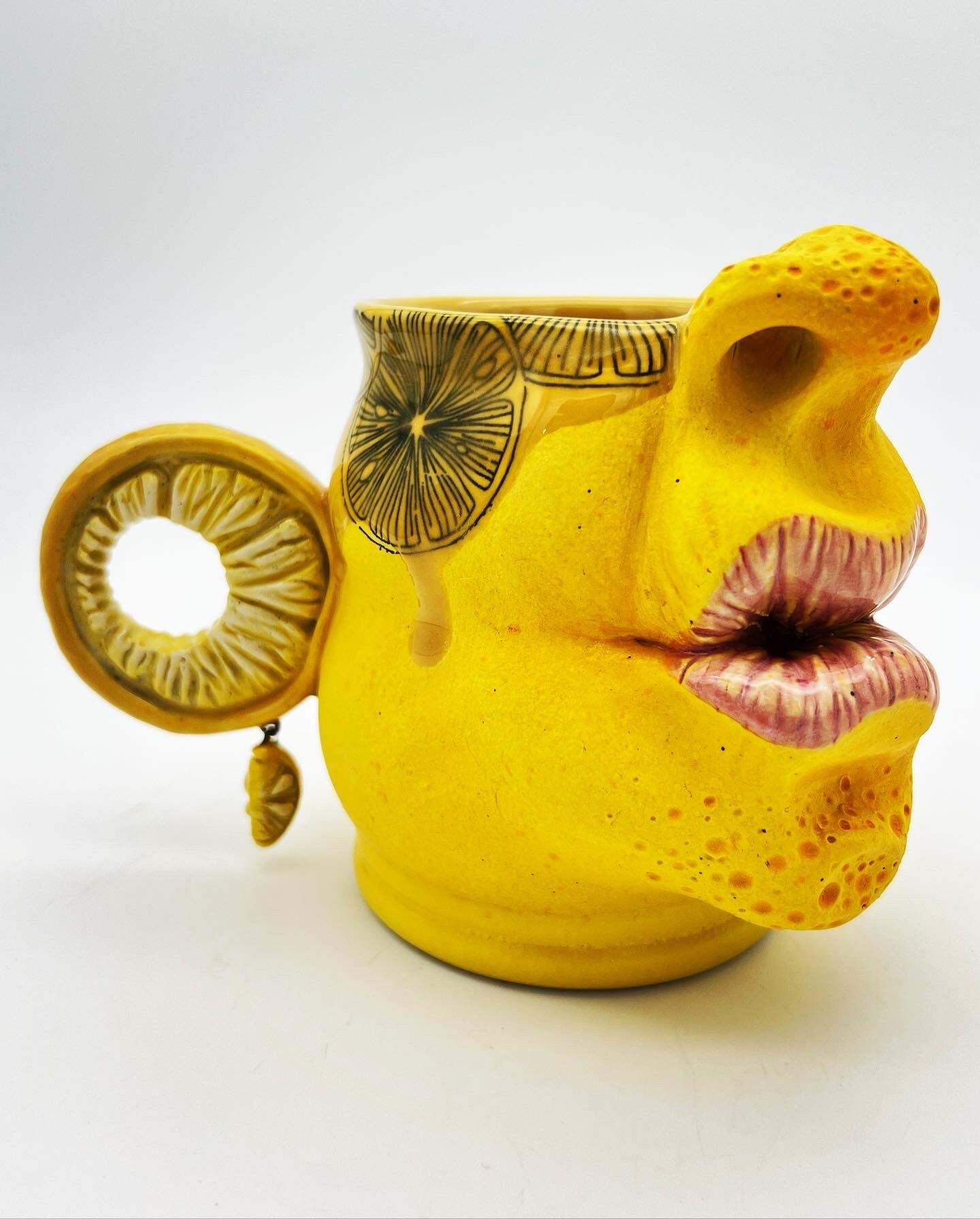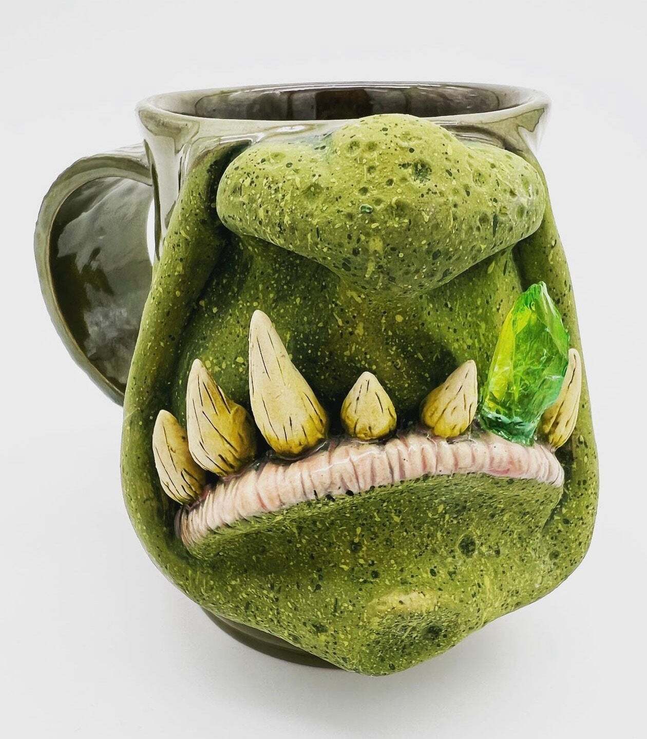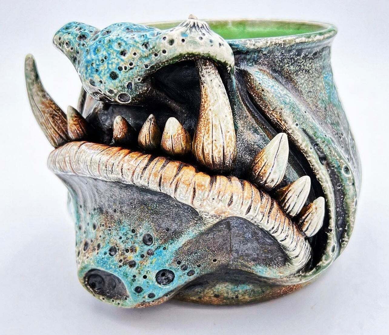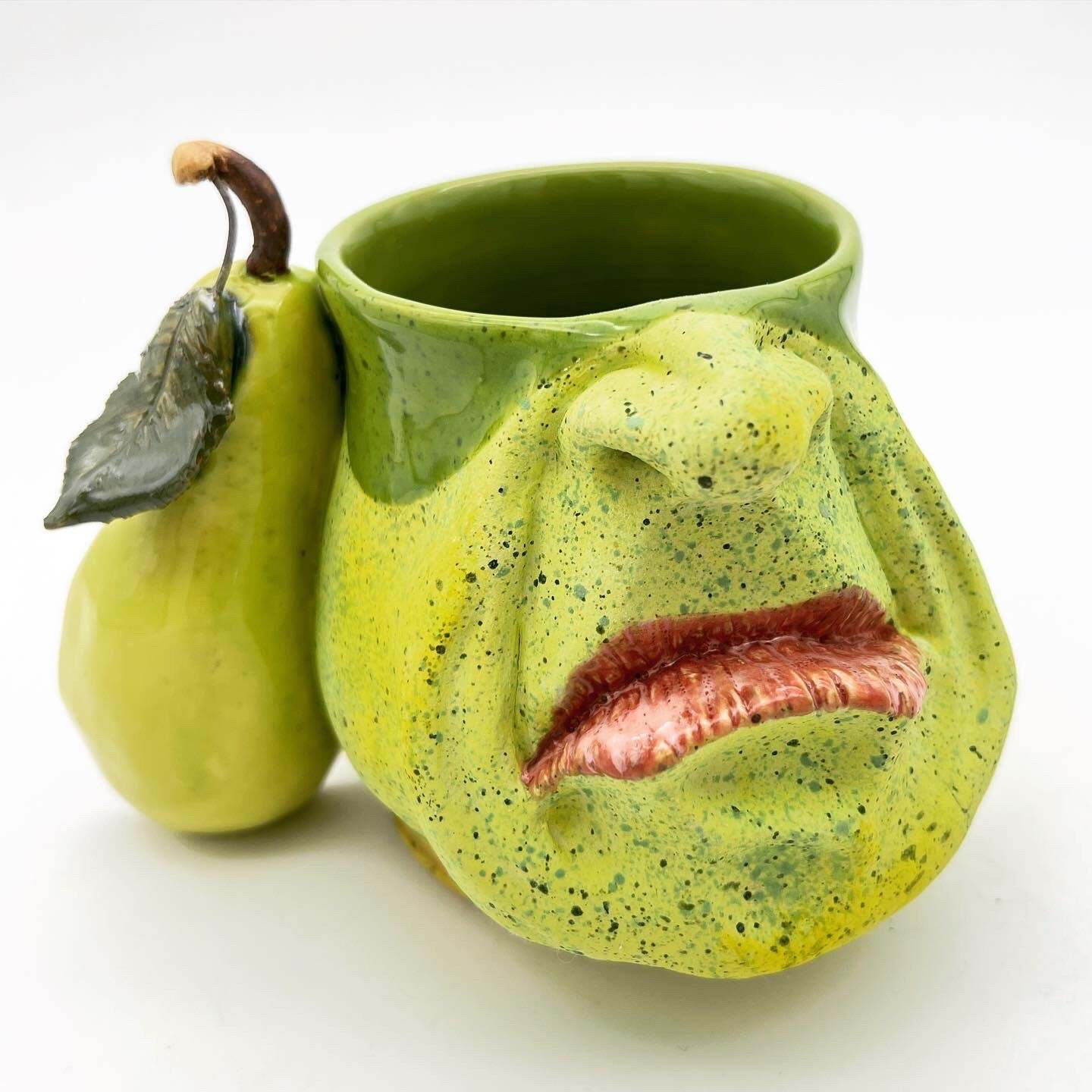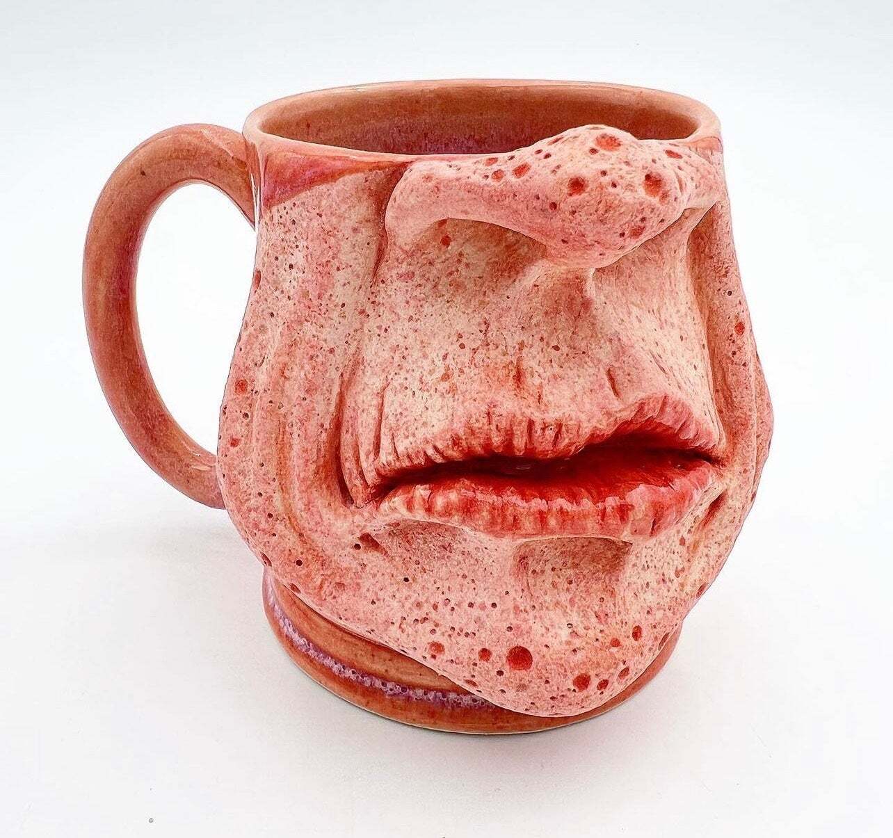 My work falls into the sculpturally altered, wheel thrown pots category. Or as they are popularly known – face pots, mugs or jugs. I love the endless possibilities of faces and the characters they embody. I make them so that the owner can become a part of that character while drinking from my mugs. I hope to make people stop and think or smile with my pottery. I use a variety of underglazes, glazes, crystals and resins to bring my ogres to life. I work in a white mid range stoneware, and I’m constantly looking for new faces to make!