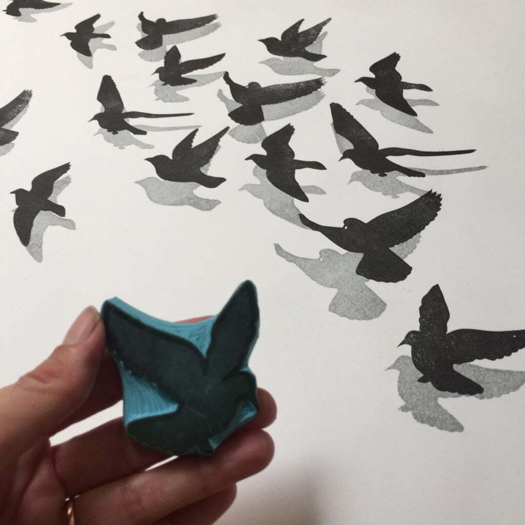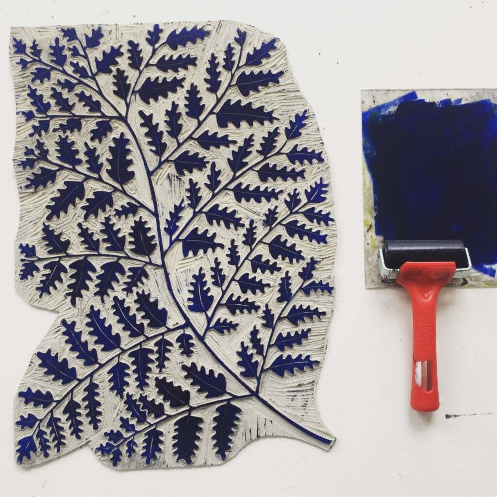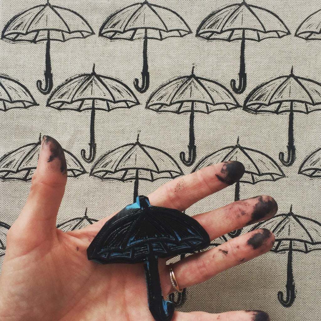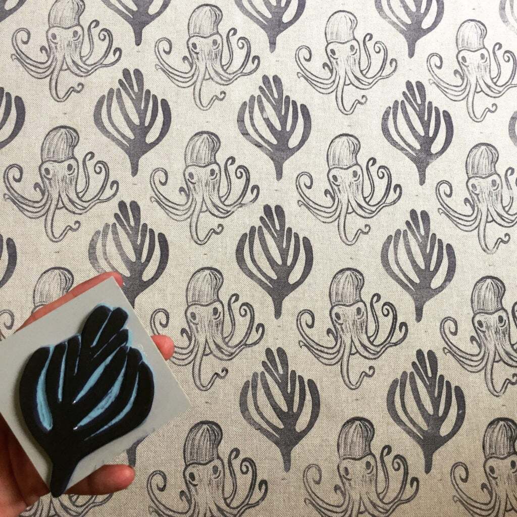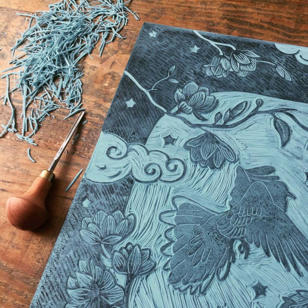 My second love, printmaking, came at a later stage when we (me, my husband and our 5 children) moved from the Netherlands to Singapore for my husband’s work. I fell in love straight away with the beautiful batik prints that are so common in that region, so I started experimenting with fabric printing right away. From potato printing to wood-carved prints and even rope-shaped stamps; I’ve tried them all. When I bumped into some carving-rubber I was hooked; I never stopped carving ever since.