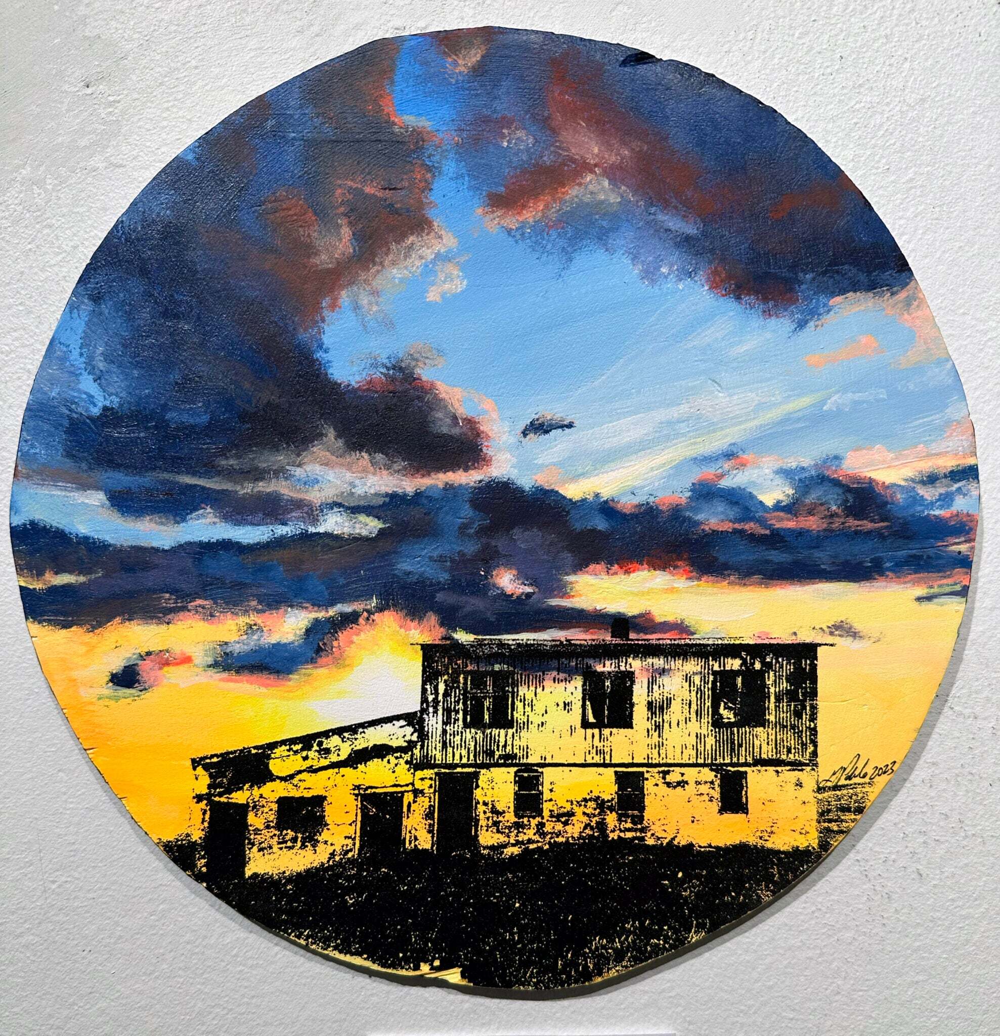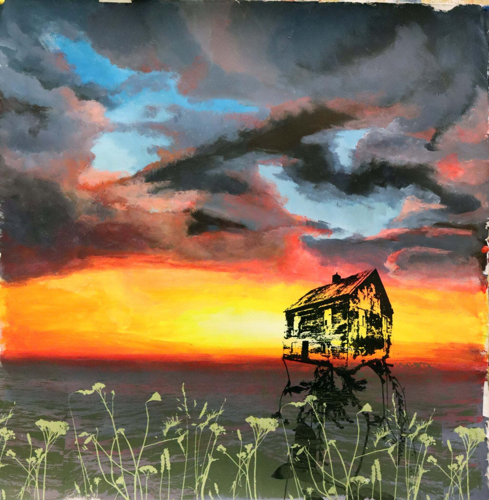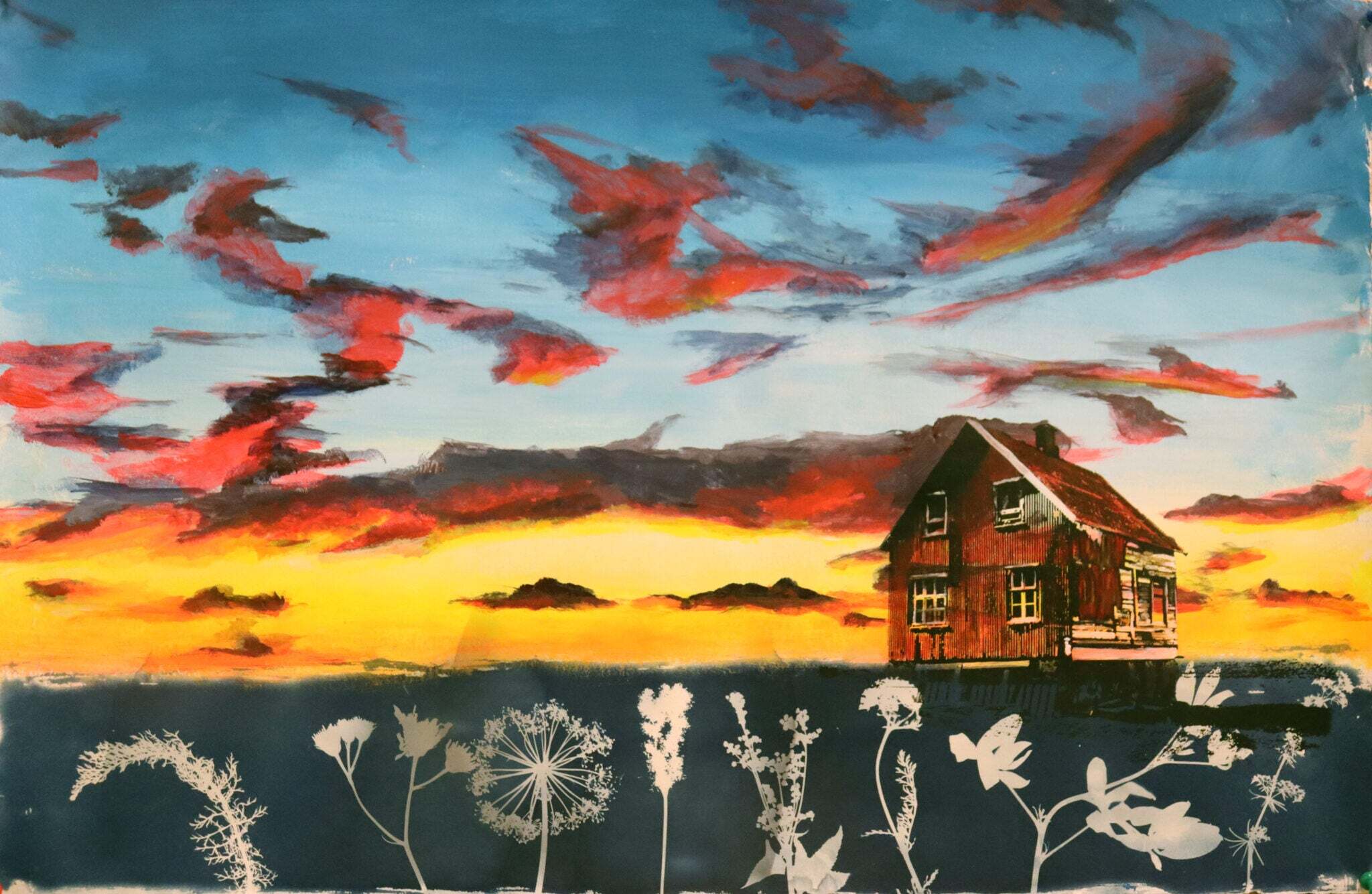 My work is a combination of printmaking, photography, and painting. I use these media to create implied narrative landscapes. I take photographic elements and print-collage them together, attempting to authentically tell the stories and histories of abandoned architecture. As nature actively reclaims them, these structures stand resiliently as testaments to their history and serve as reminders of the legacies of the people who've left them behind. My work reflects on the ways that man-made architecture is eclipsed by nature, and often nature plays a direct part in the creation of a work of art. I often harvest plants (weeds) from my garden and use them in my work. I'm perpetually enamored by their biodiversity. I work in layers: first, a background painting of a sky-scape I've witnessed, followed by layers of photo screen prints that are developed from my photographic imagery. When I photograph a building, I see it as a design element, a character in the narrative, and the silkscreen is a way of making a mark, much like a paintbrush. In this way, I piece together multiple images in such a way that they unveil the story of a place.