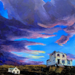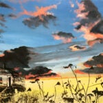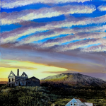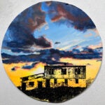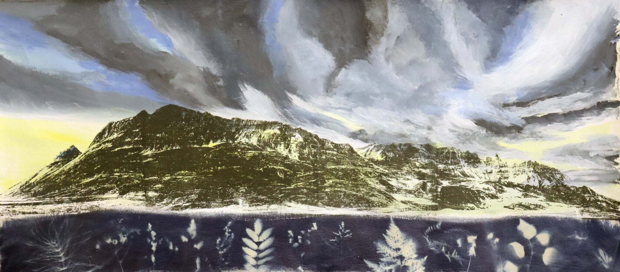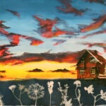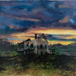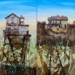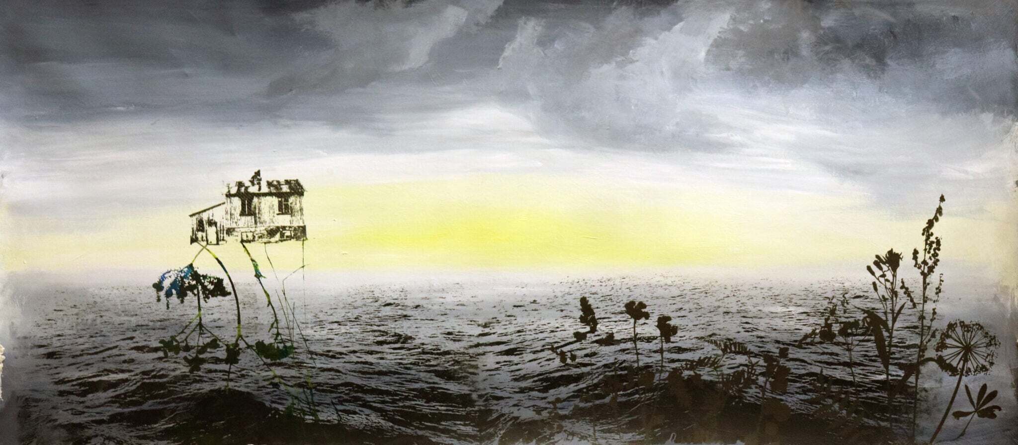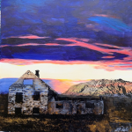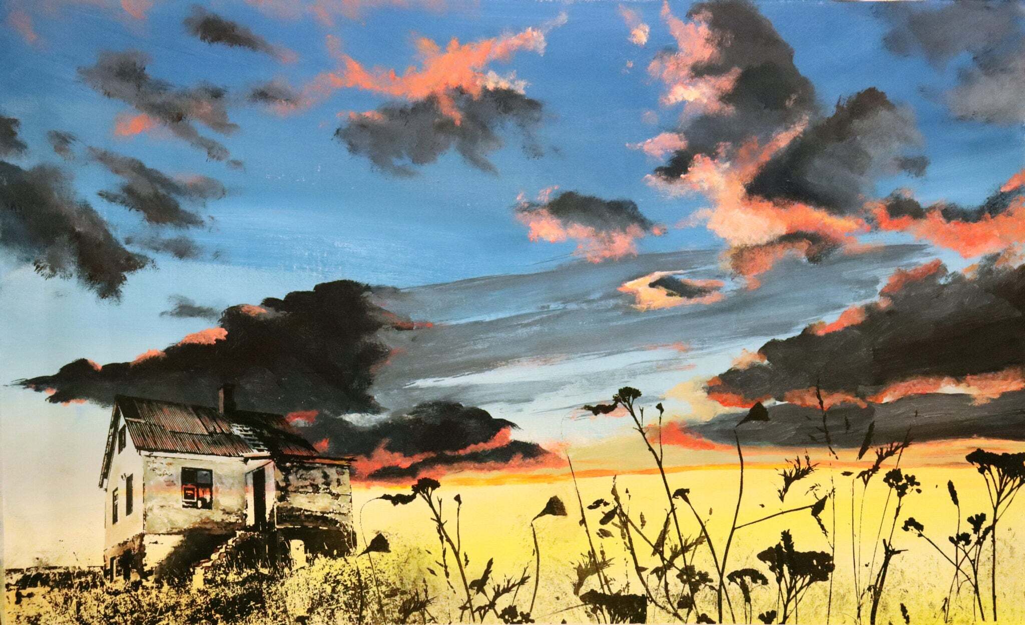 My work is a combination of printmaking, photography, and painting. I use these media to create implied narrative landscapes. I take photographic elements and print-collage them together, attempting to authentically tell the stories and histories of abandoned architecture. As nature actively reclaims them, these structures stand resiliently as testaments to their history and serve as reminders of the legacies of the people who've left them behind. My work reflects on the ways that man-made architecture is eclipsed by nature, and often nature plays a direct part in the creation of a work of art. I often harvest plants (weeds) from my garden and use them in my work. I'm perpetually enamored by their biodiversity. I work in layers: first, a background painting of a sky-scape I've witnessed, followed by layers of photo screen prints that are developed from my photographic imagery. When I photograph a building, I see it as a design element, a character in the narrative, and the silkscreen is a way of making a mark, much like a paintbrush. In this way, I piece together multiple images in such a way that they unveil the story of a place.