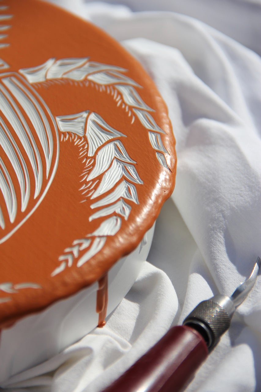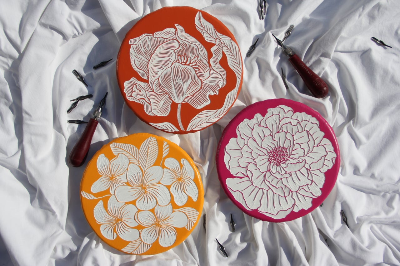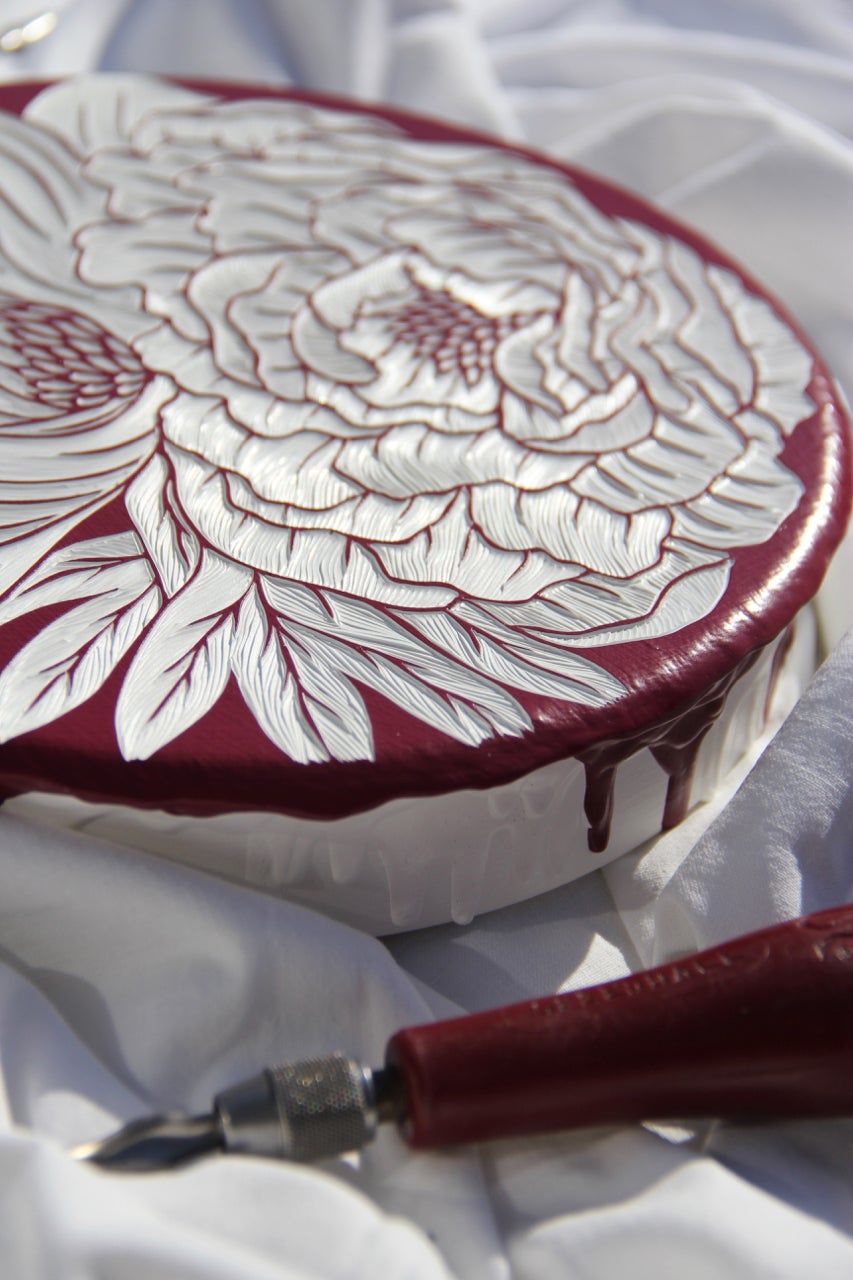 I’m Hannah Jensen, a full-time paint carver. I layer up boards with up to 70 layers of acrylic paint and then carve back through the layers to reveal the different colours below. It has a topographical effect and I enjoy emphasising texture, using nature as my main source of inspiration. When I am not in the studio, you’ll find me on the water or up a mountain. We have nature at our fingertips here in New Zealand and I make sure I make the most of it. I am also lucky to have traveled to South Africa where I spent many hours walking around my fathers game reserve before he passed away and a further 37 countries to fuel me with inspiration. But the time in South Africa with the animals was life-changing, the country and the people hold a huge place in my heart. From that stemmed my passion to carve large scale wild animals. I have been carving since I created this technique in 2003 when I was at University. I was majoring in Printmaking and experimenting with carving into wood after mainly working with etching and engraving into metals and plastics to print from. I honestly came across the technique by mistake, I did too many layers of paint on a board and had a light bulb moment when I was then able to carve into the paint before carving deeper into the wood. I now only do one-off works and the ‘layered woodblocks’ have themselves become the artworks. It is a bit like painting in reverse, all the paint is applied first and I simply reveal the artwork below. I absolutely love carving.