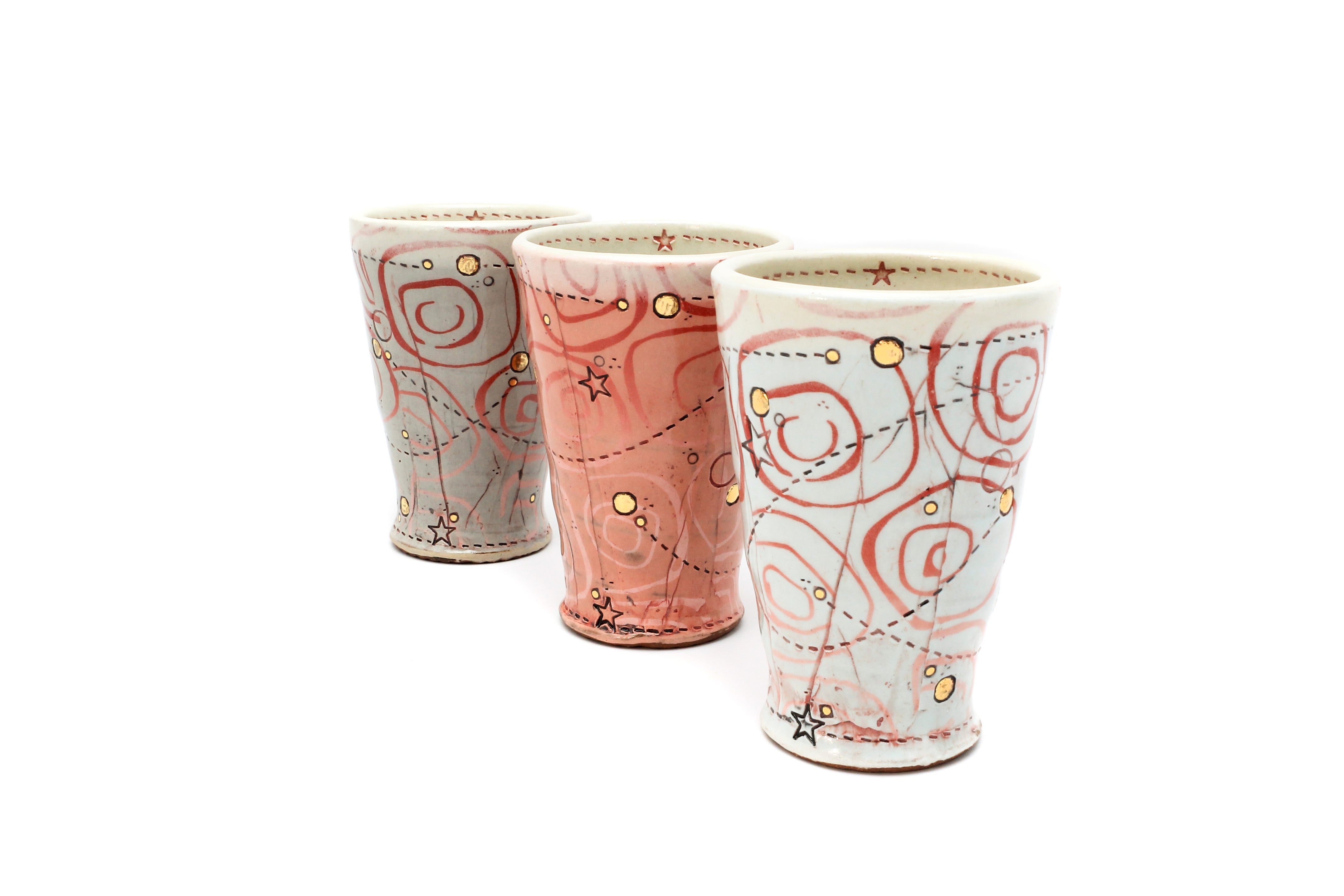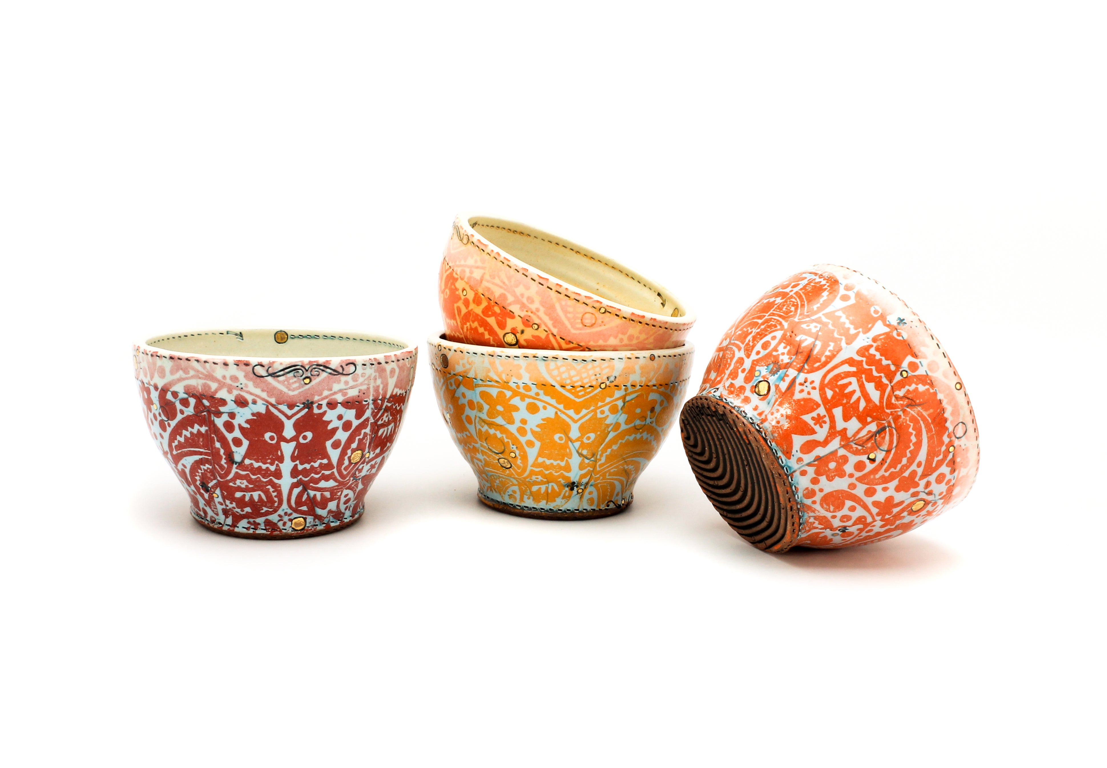 Jason Bige Burnett's fascination begins with the vocabulary of vessels and their narrations of our lives illustrating living spaces and reflecting daily routines. Coffee stained cups in the cupboards, plates hanging embellishing the walls, and teapots that remain untouched in glass cabinets are all artifacts of our own existence. Stains, cracks, and pristine luster adorned objects are stories he believes to be worth telling. As a result, Burnett achieves to create thoughtfully unrefined vessels that celebrate vulnerability and beauty. Burnett's investigations start with recollections from growing up in a “broken” family. During that time sanctuary was found in cartoons such as Nickelodean’s Ren and Stimpy, Rugrats and Ahhh! Real Monsters. He has been re-watching them recognizing how illustrators used bright colors and patterned wallpaper to excite the domestic interiors of their characters’ homes. Since then he has introduced similar elements in his pottery to promote youthful discovery. Jason Bige Burnett's intentions are to create pottery and beautiful objects that reflect life’s escapades and serve as a bridge between the real and surreal.