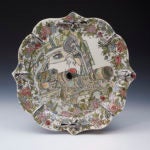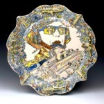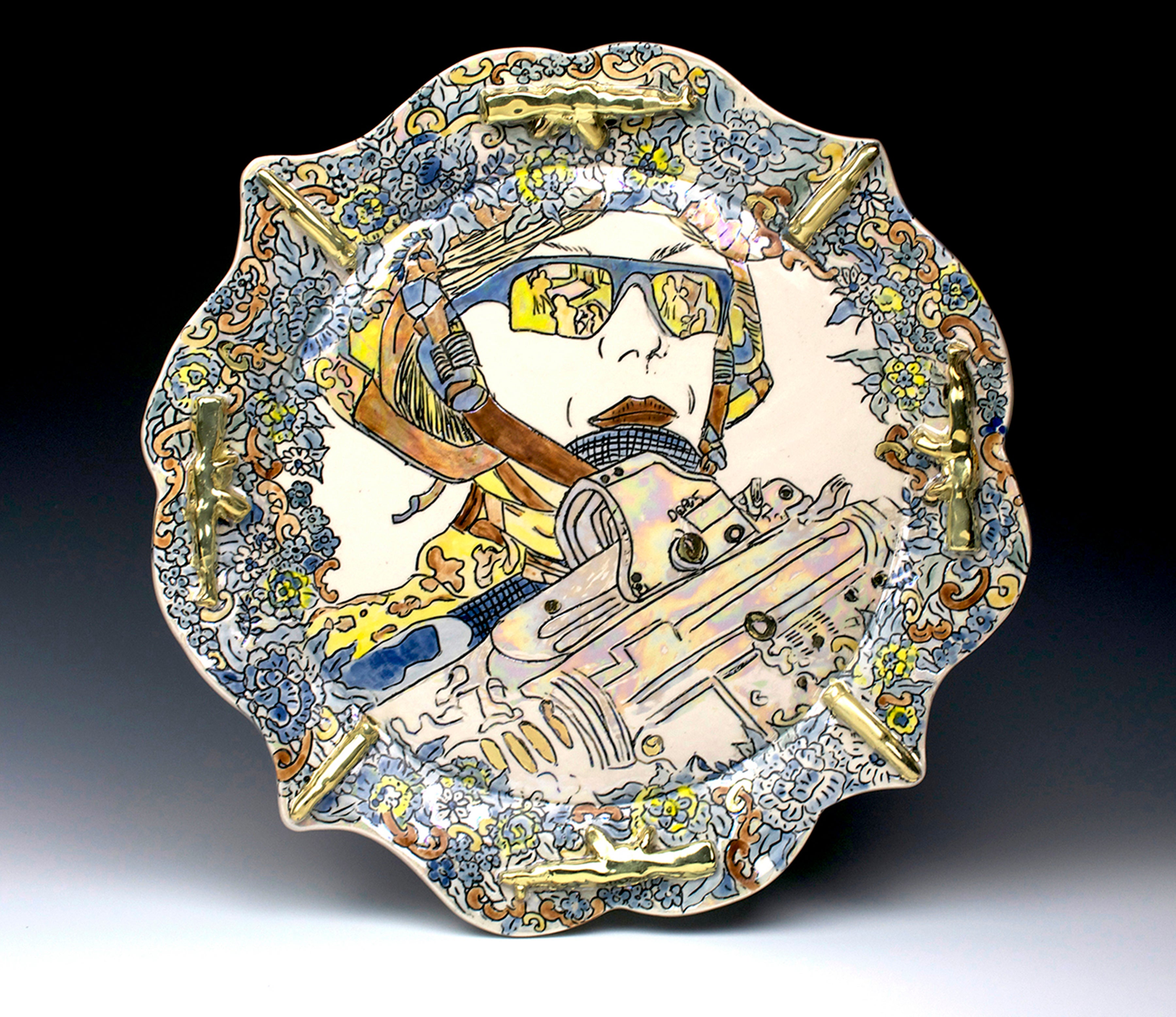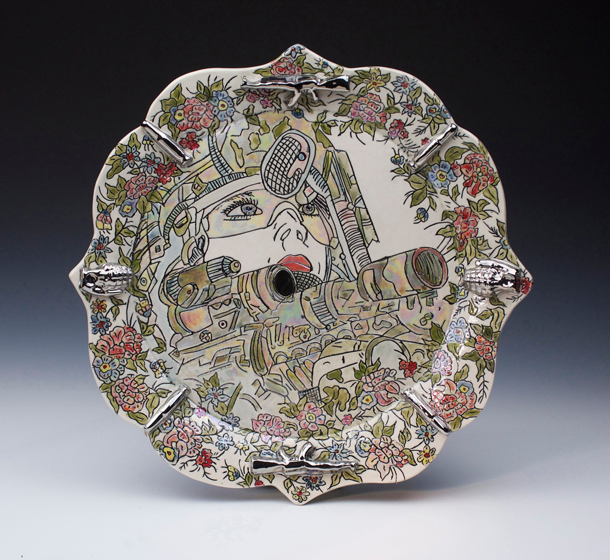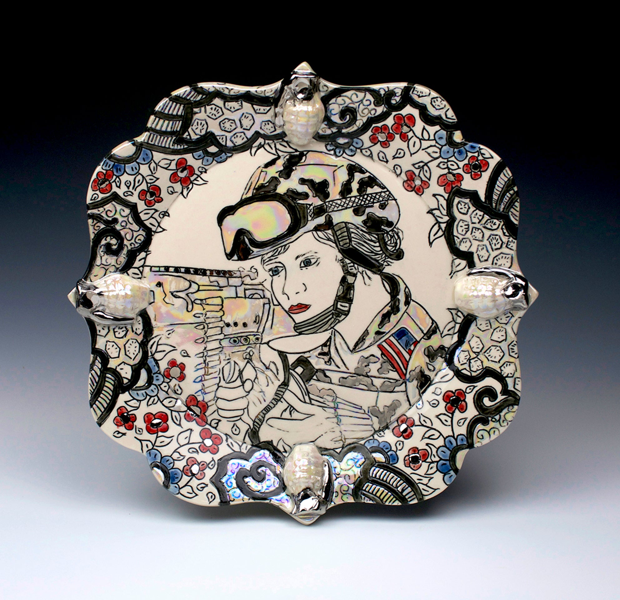 As a reflection of her military experience, Jessica explores the juxtaposition of US service women in combat with the domestic and decorative nature of heirloom tableware. Using the notion of “serving” she creates ornate decorative forms associated with serving, depicting military women serving their country. Female soldiers in a war-torn landscape are surrounded, not by enemies but by traditional floral borders embellished with gold and soft feminine colors. By combining military iconography with traditional floral elements and botanical patterns she subverts the once benign decoration while creating a personal narrative and contemporary social commentary. Through non-traditional imagery Jessica seeks to challenge the entrenched ideas of domesticity and gender roles while exposing the social and cultural issues faced by military women. This work encourages dialogue about pervasive social dynamics that prevent something perceived as violent and destructive from also being considered beautiful.