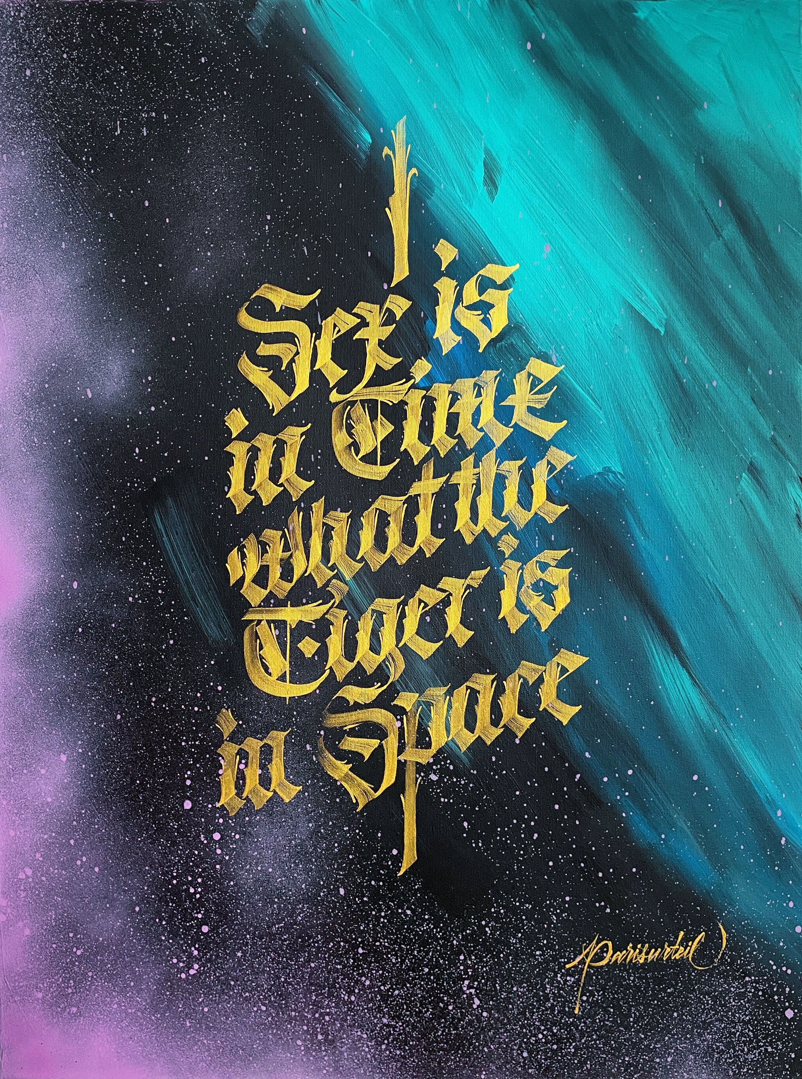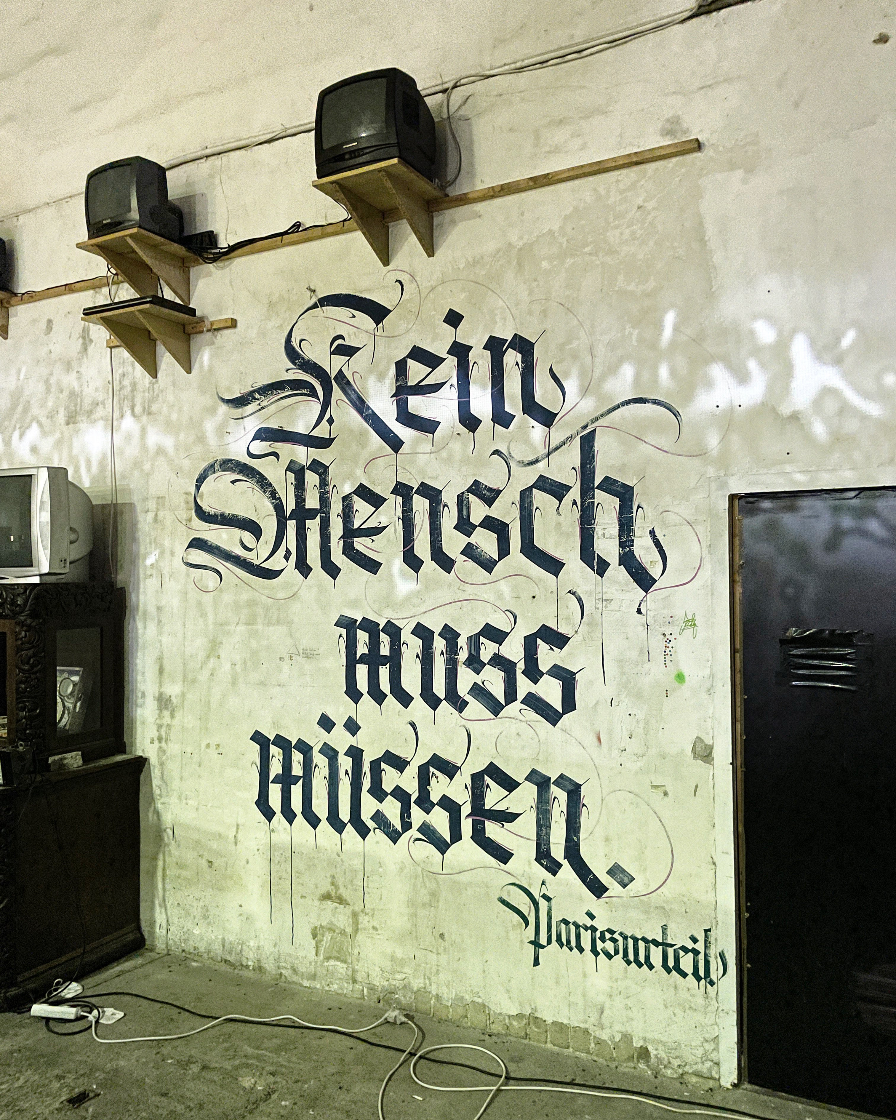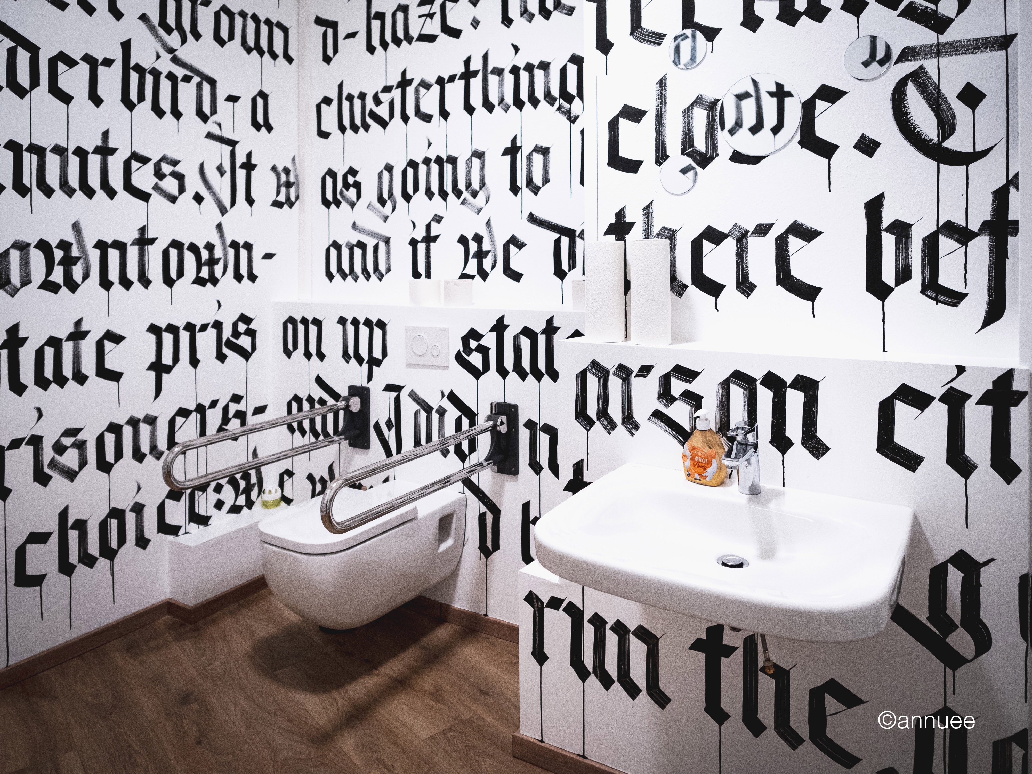Living in Berlin, the connection to urban art is pretty close. There are a lot of legal walls in this city, the urban art scene is huge and very welcoming. As calligraphy – at least broad-edged calligraphy – is pretty scalable, I quickly began writing on walls. I absolutely love the contrast between neatly and accurately writing on handmade ragged paper and going ballistic on a huge wall where color drips and flows everywhere. Both forms of calligraphy are absolutely fascinating to me.
