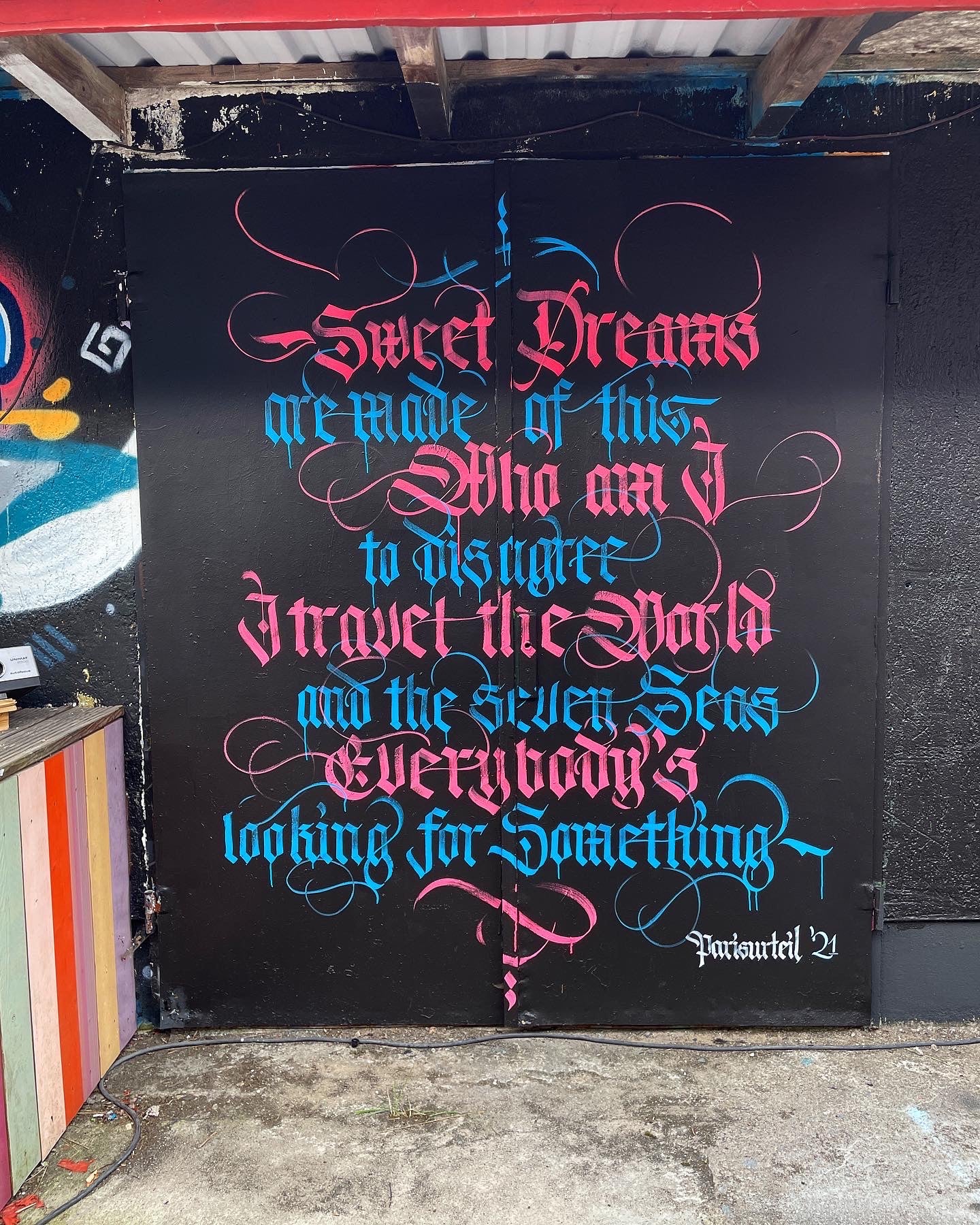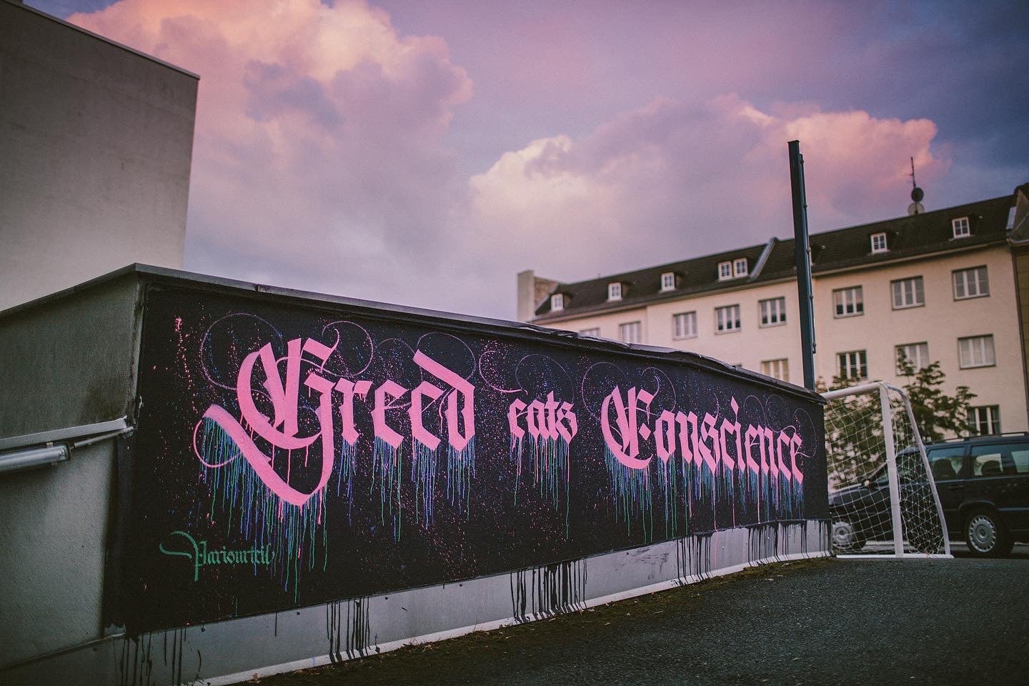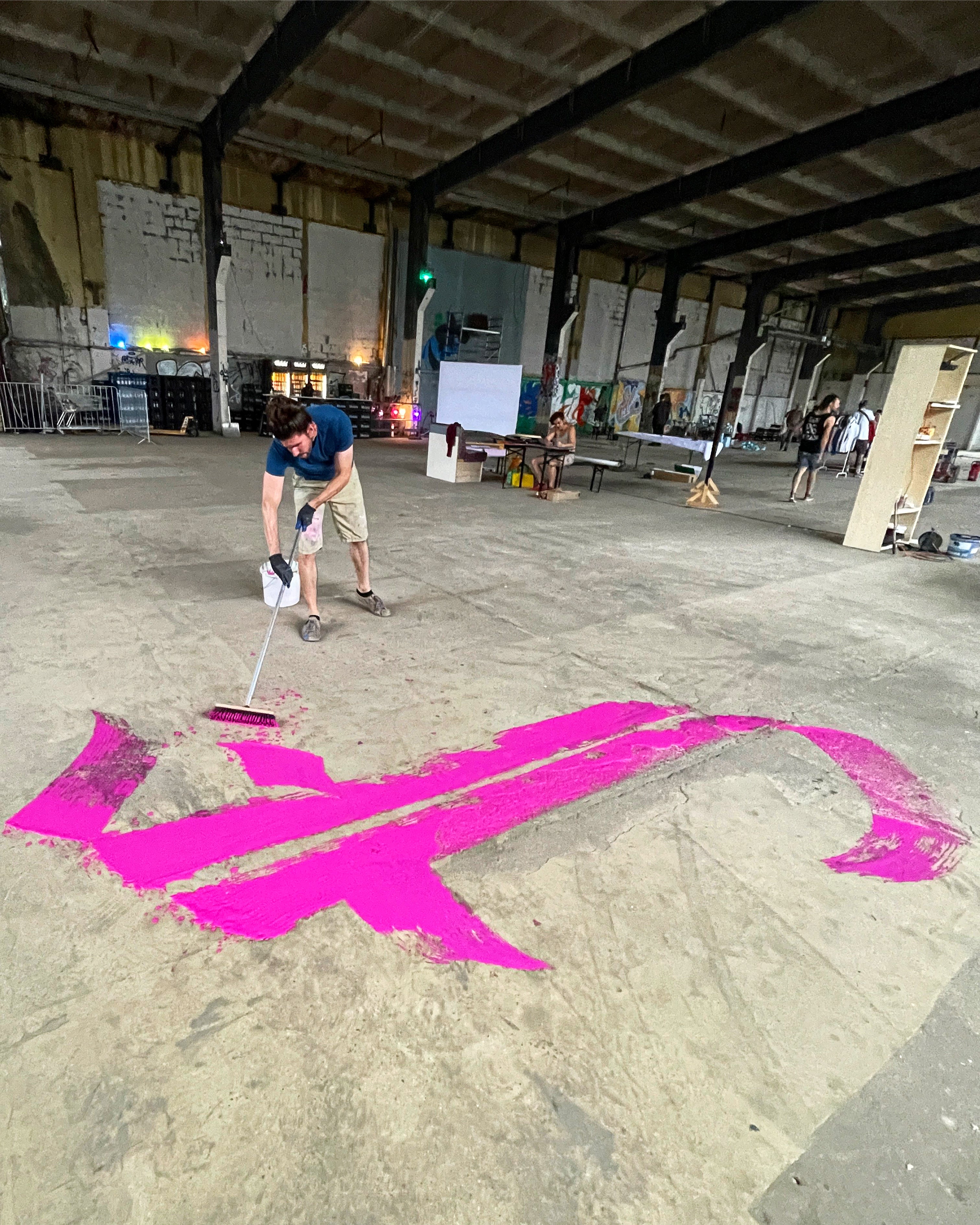 Living in Berlin, the connection to urban art is pretty close. There are a lot of legal walls in this city, the urban art scene is huge and very welcoming. As calligraphy – at least broad-edged calligraphy – is pretty scalable, I quickly began writing on walls. I absolutely love the contrast between neatly and accurately writing on handmade ragged paper and going ballistic on a huge wall where color drips and flows everywhere. Both forms of calligraphy are absolutely fascinating to me.