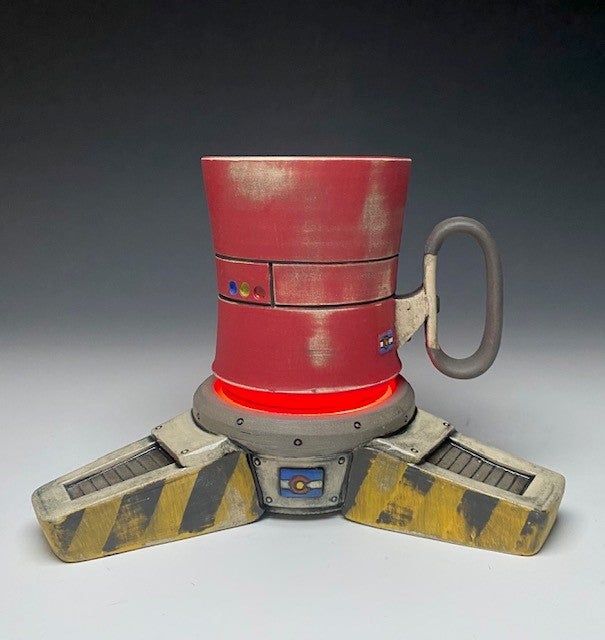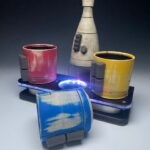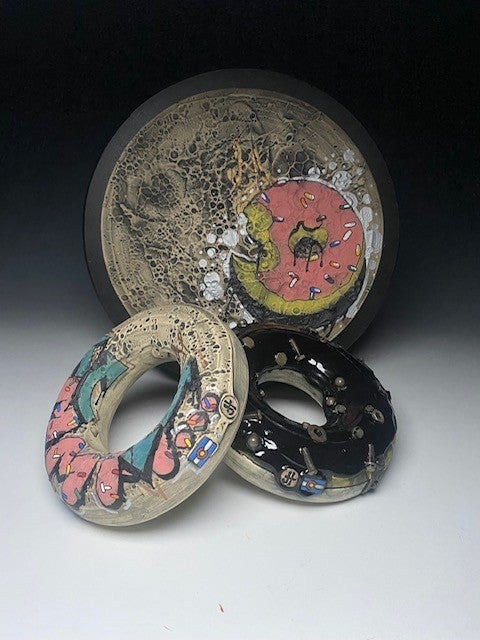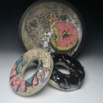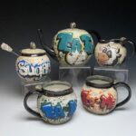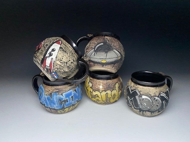 As I grew older and began to make the world of ceramics a part of my permanent life, I was able to combine two different worlds I love by grabbing inspiration from pop culture and life experiences. Working in clay allows me to sketch and draw in the third dimension, transferring ideas in my mind to come to fruition. As I begin to shape the clay my mind wanders just as much at my potter’s wheel, as it did while my imagination ran away in adolescence. Influences from different periods in art, have also driven me to create the work that I do. From artists like Roy Lichtenstein to Piet Mondrian, I find myself using simplistic colors for decoration and dark lines outlining the curves of the clay.