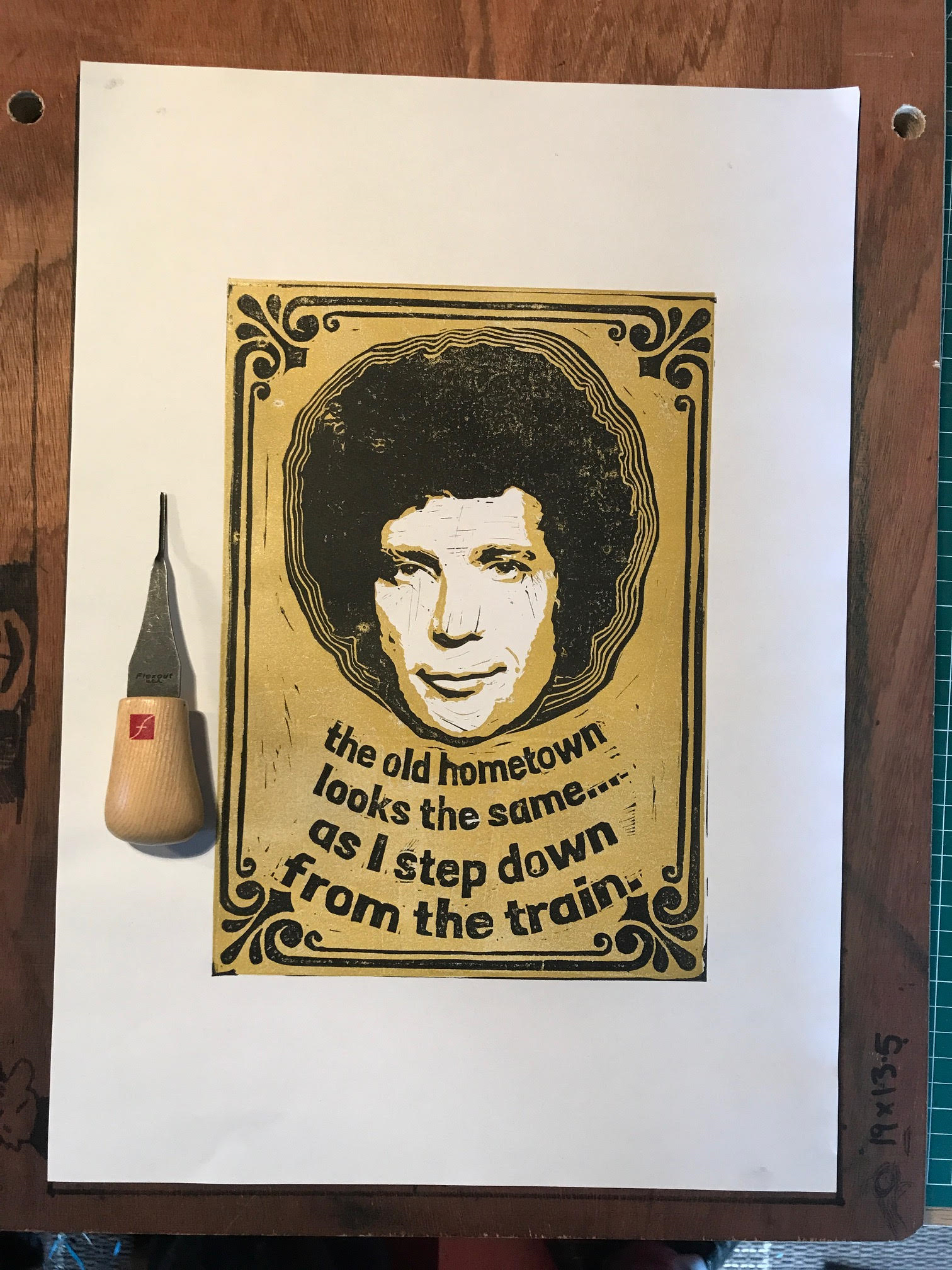 I’m really interested in the combination of image and type. My graphic design background helps a lot with composition. I am inspired by the work of The Poster Workshop 68-71 and the work of fellow Wales-based printmaker Paul Peter Piech. The print community on Instagram has been a huge source of encouragement and the Pressing Matters magazine has been a huge source of inspiration.