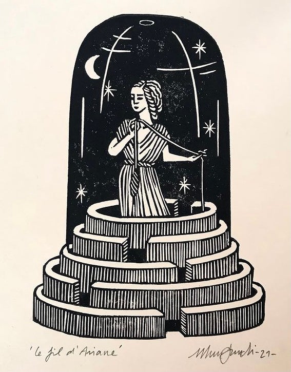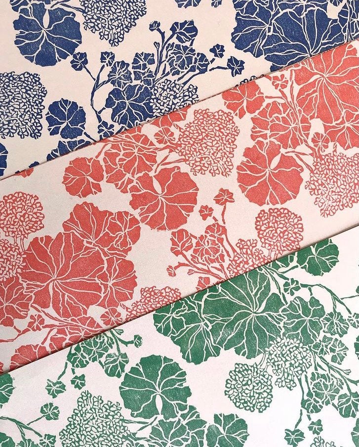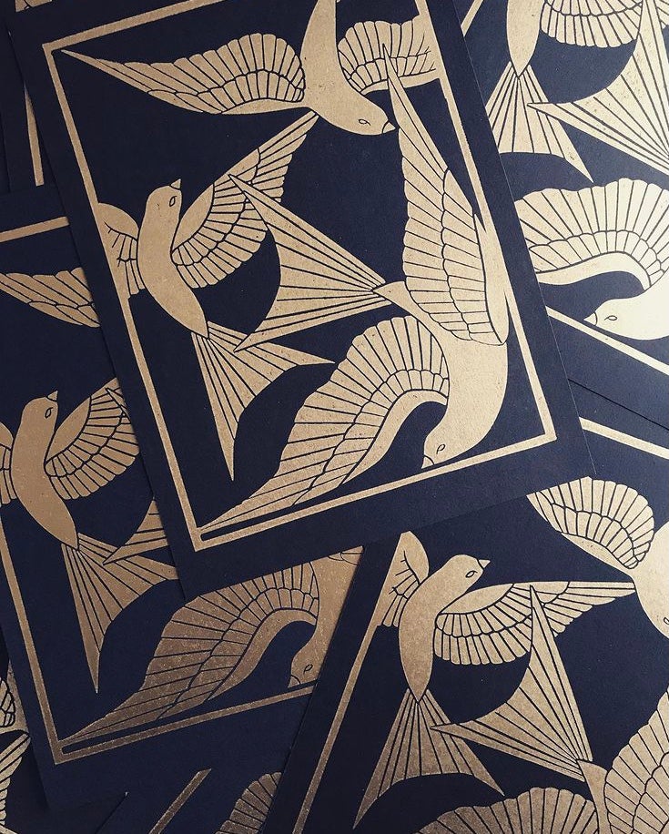 I grew up between the beautiful Aubrac area and the Mediterranean island of Corsica where I take my inspiration from. Nature, mythology but also Grimms and Andersen tales are my main inspiration. I studied Fashion design in London and came across printmaking during my foundation year. I started with silk screen printing but fell in love with lino carving. As far as I remember I've been fascinated by vintage patterns, old wallpapers and I love designing and printing both paper and fabrics.