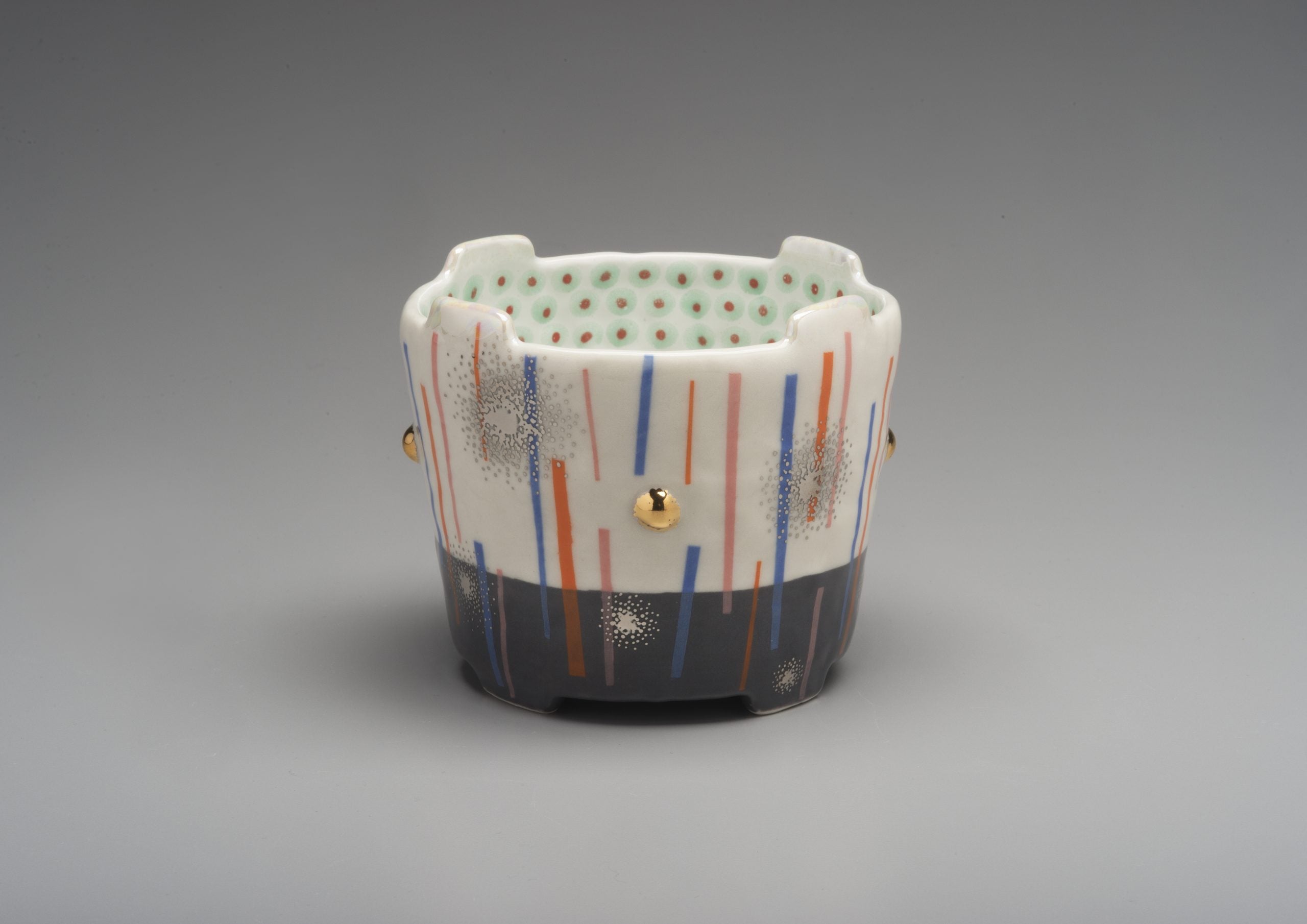 Melissa Mytty was born and raised in the suburbs of Detroit, Michigan. She received her BFA in ceramics from the College for Creative Studies in Detroit in 2005 and her MFA in ceramics from Cranbrook Academy of Art in Bloomfield Hills, Michigan in 2007. She then moved to Philadelphia, Pennsylvania to be a Resident Artist at The Clay Studio from 2007 through 2012. Mytty’s work focuses on the vessel format created by hand building techniques of pinching and coiling. She is intrigued by combinations of patterning such as the play of polka dots juxtaposed by prints reminiscent of elegance and formality. Her surfaces are eccentrically patterned with layers of pigment, glaze and luster. Mytty has exhibited nationally and is currently living and working out of her studio in Collegeville, Pennsylvania.