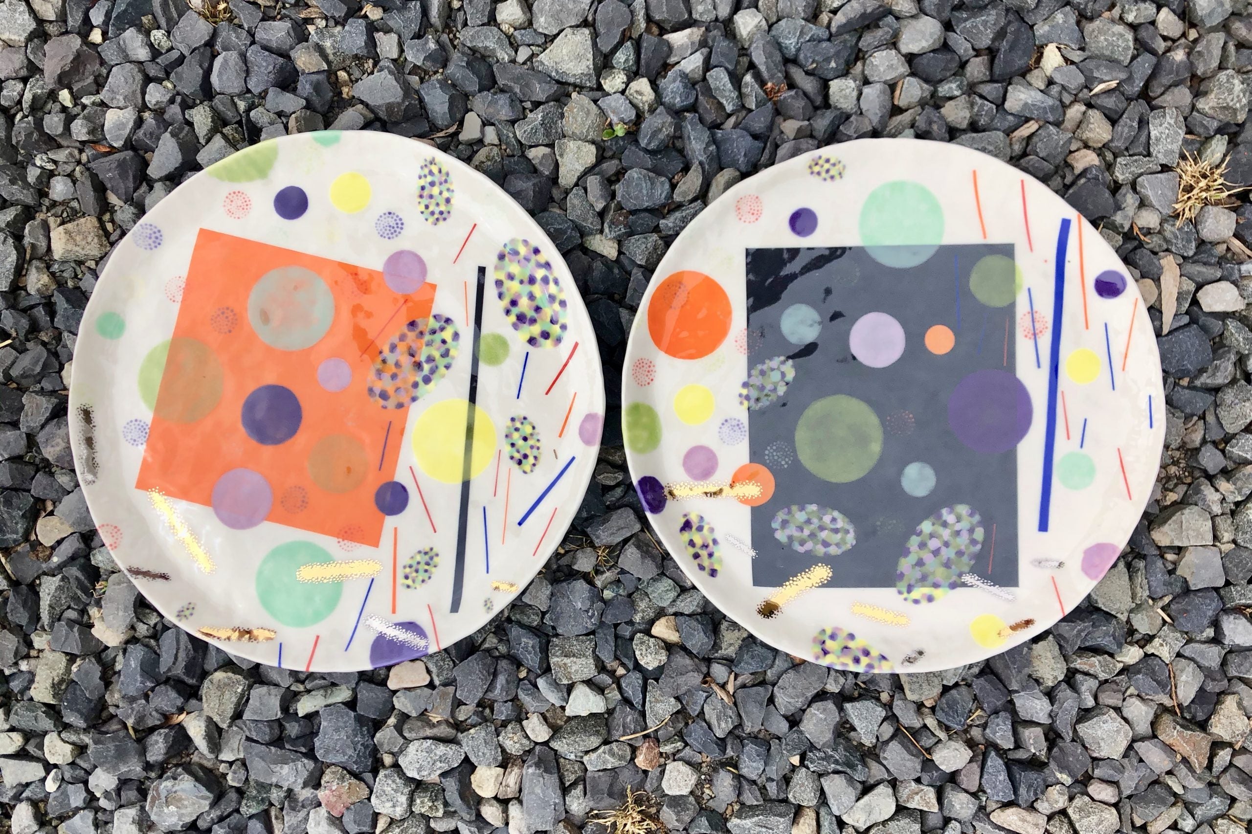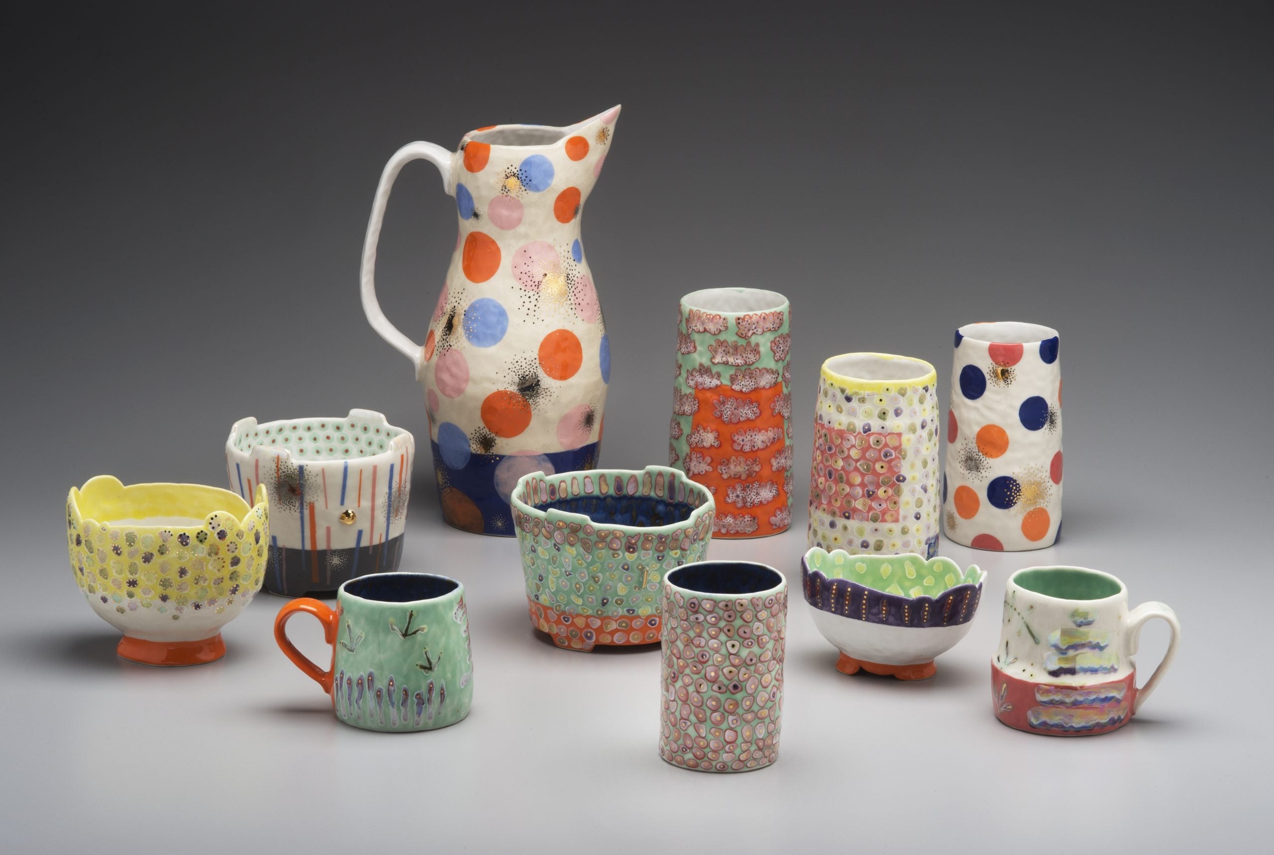 The ceramic vessel is the focus of my investigation in my studio. I make forms using both pinching and slab building techniques. I enjoy combining various colors and techniques to achieve depth of surface and interesting results. The glaze is brushed onto the pots so the surfaces take on a painterly quality. I see the surfaces as a combination of Color Field painting converged with Ben Day dots of Pop Art. The surfaces are layered with under glazes, glazes and luster; I am interested in the combinations of these materials and their resulting emotive qualities. In some areas, there are four or five layers of glaze that create a depth of field concealing underlying colors in some areas and revealing in others. I strive to make beautiful, colorful and happy artwork to function well and bring joy to every day objects.