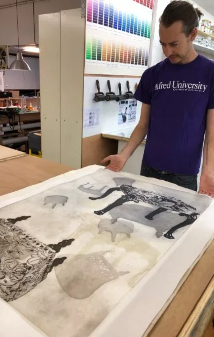 Myles Calvert was born in Collingwood, Ontario (Canada). He attended the University of Guelph with a focus in printmaking and art history, before travelling to London, UK where he completed his MA in Printmaking at Camberwell College of Art. Major bodies of work included mass installations of screen printed toast and the idolization of popular British celebrity culture. During this time he worked for the National Portrait Gallery at Trafalgar Square before moving to Hastings in East Sussex to teach printmaking at Sussex Coast College and become Duty Manager of the newly built Jerwood Gallery (now Hastings Contemporary). Toast continued with a 43000 slice installation during the Queen’s ‘Diamond Jubilee’ with college students, drawing BBC media attention and culminated in two solo exhibitions before making a return to the University of Guelph to teach Advanced and Experimental Printmaking. Myles is currently a Visiting Professor in Expanded Media at Alfred University, New York State College of Ceramics and a Sessional Instructor at OCADU (Ontario College of Arts and Design University) in Toronto.